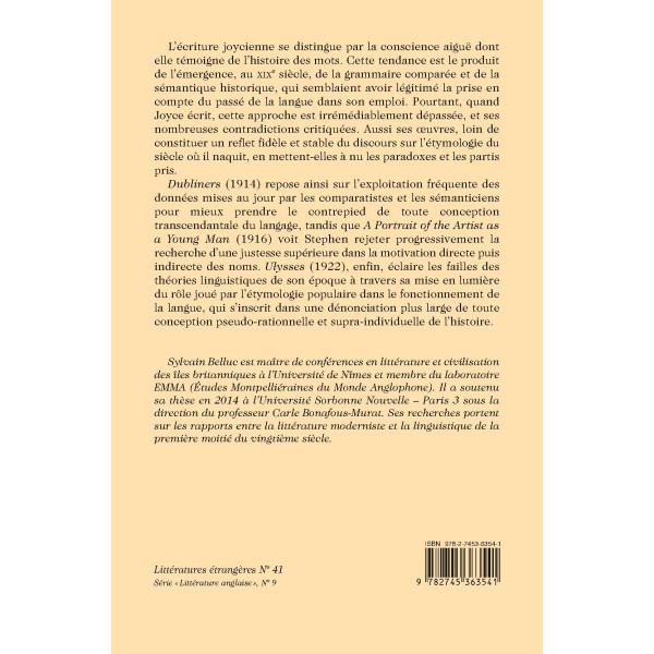 L’écriture joycienne se distingue par la conscience aiguë dont elle témoigne de l’histoire des mots. Cette tendance est le produit de l’émergence, au XIXe siècle, de la grammaire comparée et de la sémantique historique, qui semblaient avoir légitimé la prise en compte du passé de la langue dans son emploi. Pourtant, quand Joyce écrit, cette approche est irrémédiablement dépassée, et ses nombreuses contradictions critiquées. Aussi ses œuvres, loin de constituer un reflet fidèle et stable du discours sur l’étymologie du siècle où il naquit, en mettent-elles à nu les paradoxes et les partis pris.