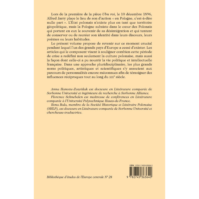 Lors de la première de la pièce Ubu roi, le 10 décembre 1896, Alfred Jarry place son lieu d’action « en Pologne, c’est-à-dire nulle part ». La Pologne indépendante n’existe plus en tant que territoire géopolitique, mais elle subsiste dans le coeur des Polonais qui portent en eux le souvenir de sa désintégration et qui tentent de conserver ou de recréer son identité dans leurs discours, leurs poèmes ou leurs habitudes. Le présent volume propose de revenir sur ce moment crucial pendant lequel l’un des grands pays d’Europe a cessé d’exister. Les articles qui le composent visent à souligner combien cette période de crise a redéfini non seulement la culture polonaise, mais aussi la façon dont celle-ci a pu nourrir la vie politique et intellectuelle française. Dans une approche pluridisciplinaire, les plus grands noms politiques, artistiques et scientifiques s’y associent aux parcours de personnalités encore méconnues afin de témoigner des influences réciproques tout au long du XIXe siècle.