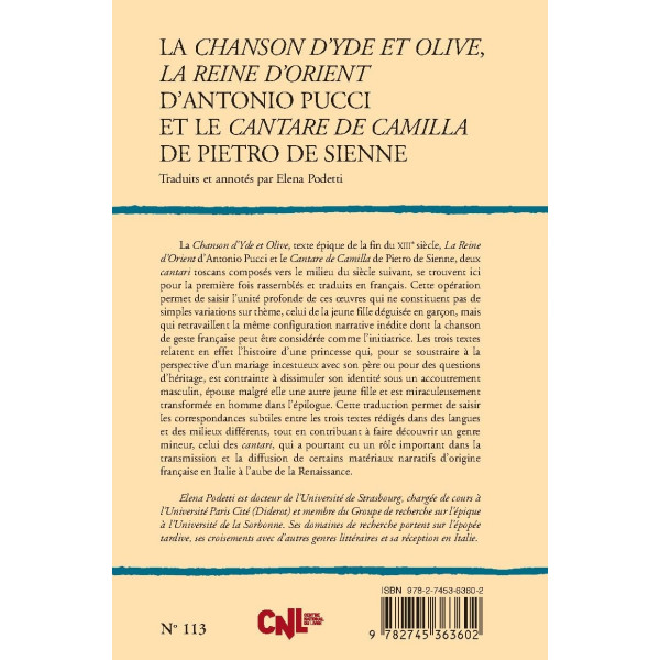 La Chanson d’Yde et Olive, texte épique de la fin du XIIIe siècle, La Reine d’Orient d’Antonio Pucci et le Cantare de Camilla de Pietro de Sienne, deux cantari toscans composés vers le milieu du siècle suivant, se trouvent ici pour la première fois rassemblés et traduits en français. Cette opération permet de saisir l’unité profonde de ces oeuvres qui ne constituent pas de simples variations sur thème, celui de la jeune fille déguisée en garçon, mais qui retravaillent la même configuration narrative inédite dont la chanson de geste française peut être considérée comme l’initiatrice. Les trois textes relatent en effet l’histoire d’une princesse qui, pour se soustraire à la perspective d’un mariage incestueux avec son père ou pour des questions d’héritage, est contrainte à dissimuler son identité sous un accoutrement masculin, épouse malgré elle une autre jeune fille et est miraculeusement transformée en homme dans l’épilogue. Cette traduction permet de saisir les correspondances subtiles entre les trois textes rédigés dans des langues et des milieux différents, tout en contribuant à faire découvrir un genre mineur, celui des cantari, qui a pourtant eu un rôle important dans la transmission et la diffusion de certains matériaux narratifs d’origine française en Italie à l’aube de la Renaissance.