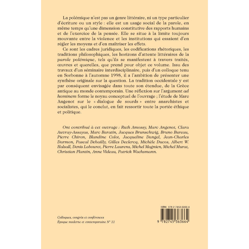 Ce sont les cadres juridiques, les codifications rhétoriques, les traditions philosophiques, les horizons d’attente littéraires de la parole polémique, tels qu’ils se manifestent à travers traités, œuvres et querelles, que prend pour objet ce volume. Issu des travaux d’un séminaire interdisciplinaire, puis d’un colloque tenu en Sorbonne à l’automne 1998, il a l’ambition de présenter une synthèse originale sur la question. La tradition occidentale y est par conséquent envisagée dans toute son étendue, de la Grèce antique au monde contemporain. Une réflexion sur l’argument ad hominem forme le noyau conceptuel de l’ouvrage ; l’étude de Marc Angenot sur le « dialogue de sourds » entre anarchistes et socialistes, qui le conclut, en fait ressortir toute la portée éthique et politique.