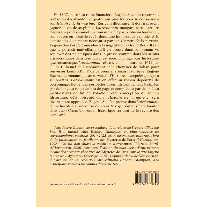 Jean-Pierre Galvan est spécialiste de la vie et de l’œuvre d’Eugène Sue. Il a publié, chez Honoré Champion en cinq volumes sa correspondance générale (2010-2023) et, en deux tomes, celle reçue lors de la publication en feuilleton des Mystères de Paris (L’Harmattan, 1998). On lui doit aussi la réédition d’Aventures d’Hercule Hardi (L’Harmattan, 2020) ainsi que l’édition du manuscrit d’une version inédite des premiers chapitres des Mystères de Paris, sous le titre Eugène Sue et ses « Mystères » (Encrage, 2018). Depuis le début de l’année 2024, il s’occupe de la réédition aux éditions Honoré Champion, des principaux romans méconnus d’Eugène Sue.
