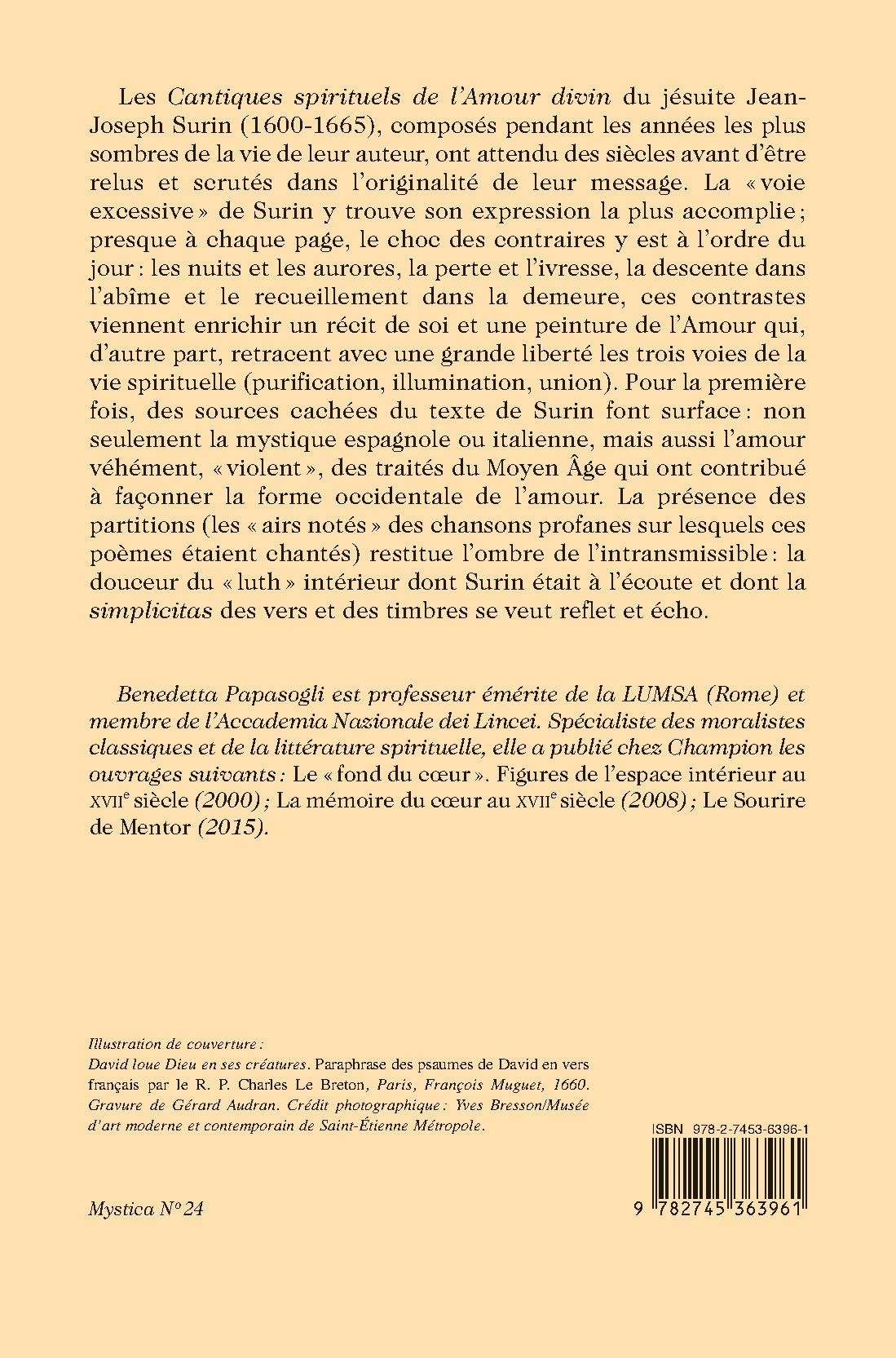 Les Cantiques spirituels de l’Amour divin du jésuite Jean-Joseph Surin (1600-1665), composés pendant les années les plus sombres de la vie de leur auteur, ont attendu des siècles avant d’être relus et scrutés dans l’originalité de leur message. La « voie excessive » de Surin y trouve son expression la plus accomplie ; presque à chaque page, le choc des contraires y est à l’ordre du jour : les nuits et les aurores, la perte et l’ivresse, la descente dans l’abîme et le recueillement dans la demeure, ces contrastes viennent enrichir un récit de soi et une peinture de l’Amour qui, d’autre part, retracent avec une grande liberté les trois voies de la vie spirituelle (purification, illumination, union). Pour la première fois, des sources cachées du texte de Surin font surface : non seulement la mystique espagnole ou italienne, mais aussi l’amour véhément, « violent », des traités du Moyen Âge qui ont contribué à façonner la forme occidentale de l’amour. La présence des partitions (les « airs notés » des chansons profanes sur lesquels ces poèmes étaient chantés) restitue l’ombre de l’intransmissible : la douceur du « luth » intérieur dont Surin était à l’écoute et dont la simplicitas des vers et des timbres se veut reflet et écho.