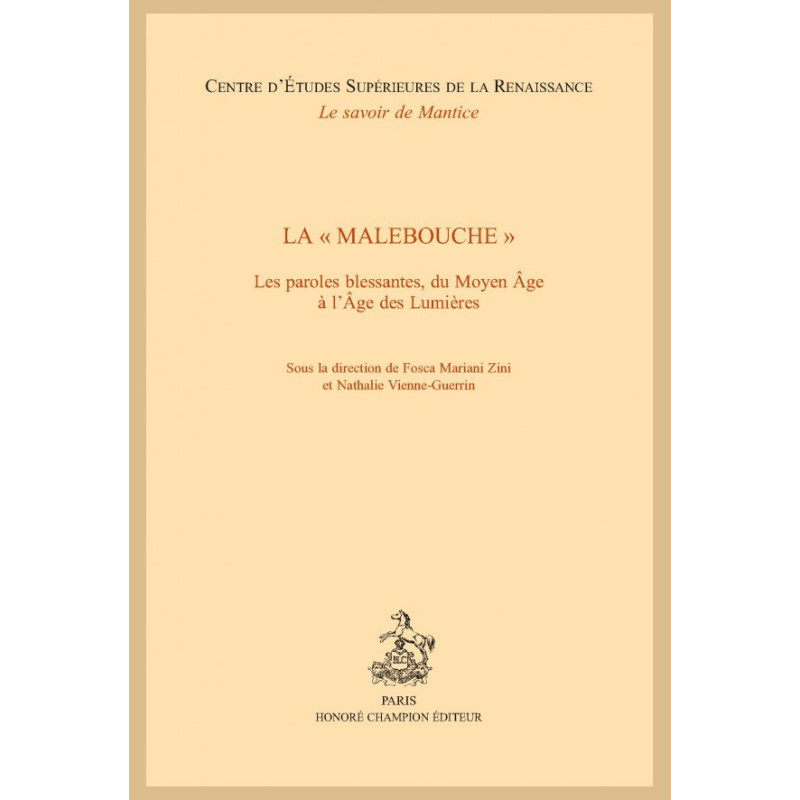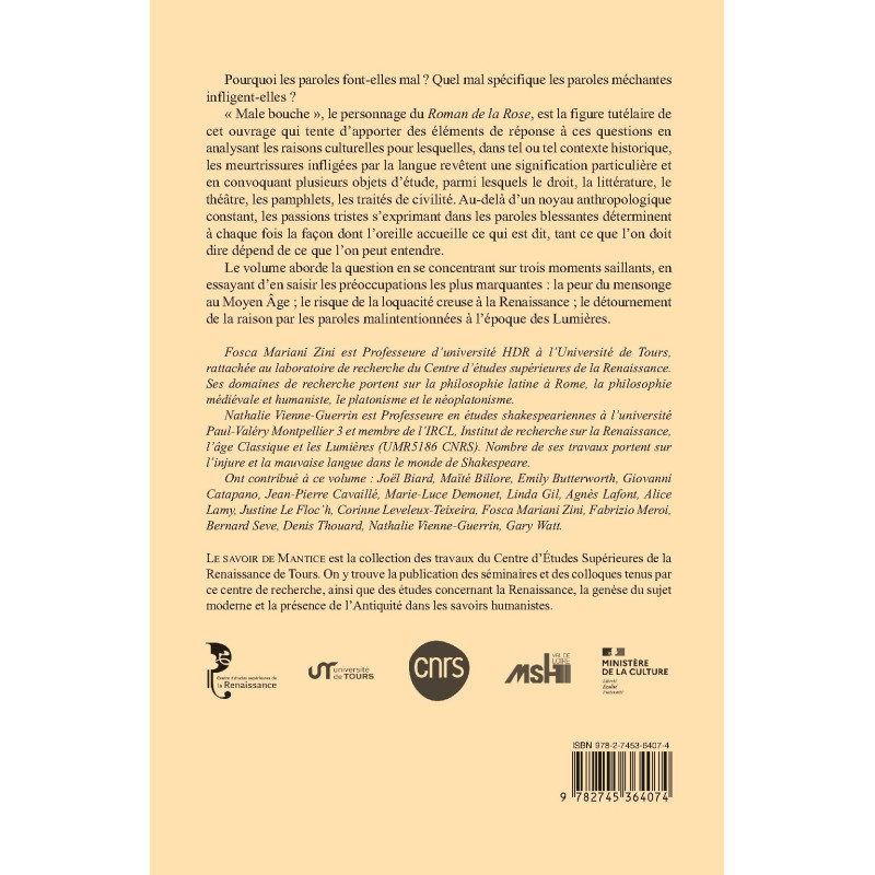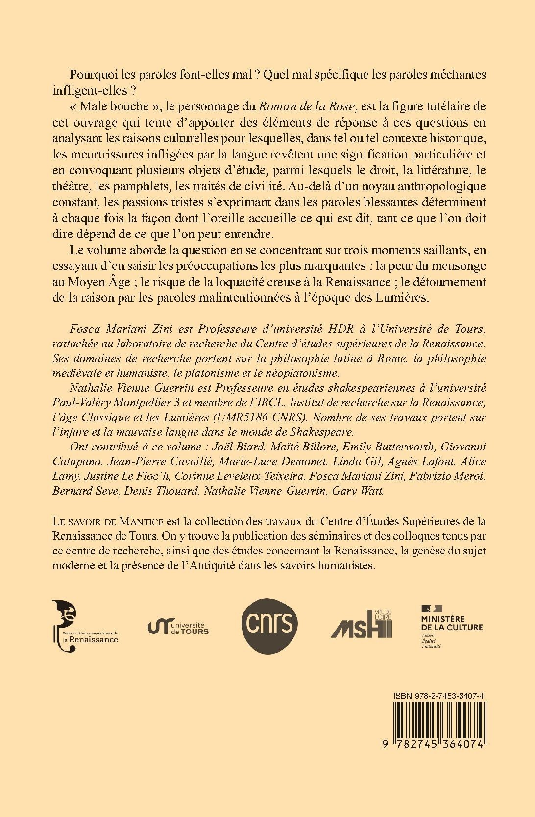 « Male bouche », le personnage du Roman de la Rose, est la figure tutélaire de cet ouvrage qui tente d’apporter des éléments de réponse à ces questions en analysant les raisons culturelles pour lesquelles, dans tel ou tel contexte historique, les meurtrissures infligées par la langue revêtent une signification particulière et en convoquant plusieurs objets d’étude, parmi lesquels le droit, la littérature, le théâtre, les pamphlets, les traités de civilité. Au-delà d’un noyau anthropologique constant, les passions tristes s’exprimant dans les paroles blessantes déterminent à chaque fois la façon dont l’oreille accueille ce qui est dit, tant ce que l’on doit dire dépend de ce que l’on peut entendre.
