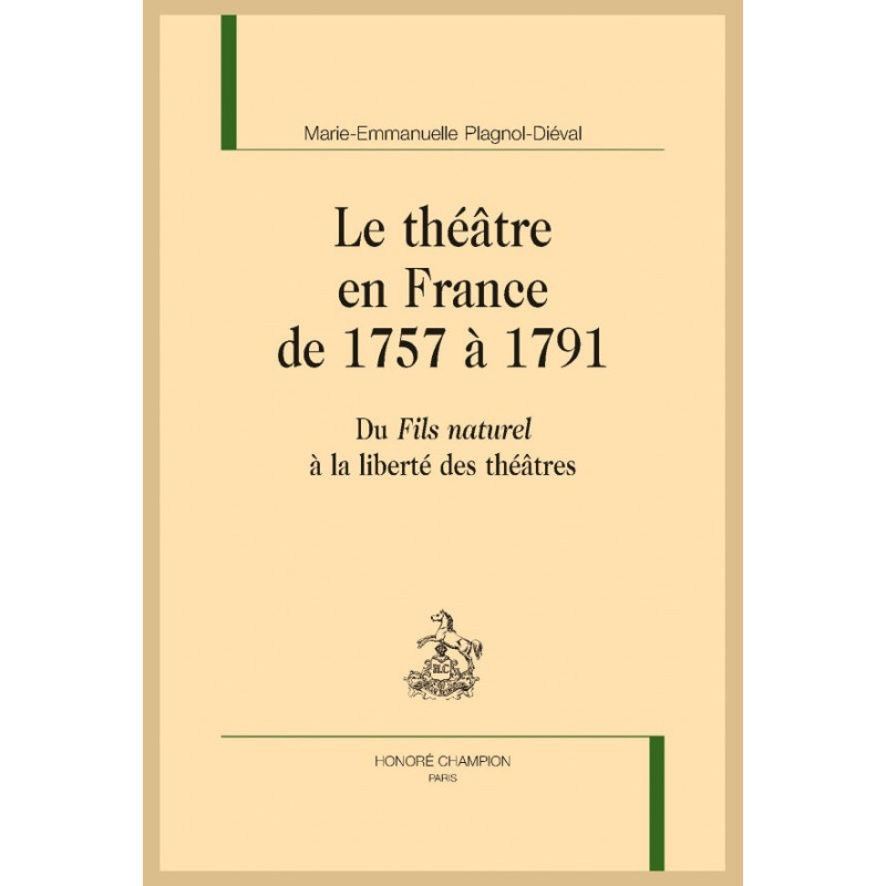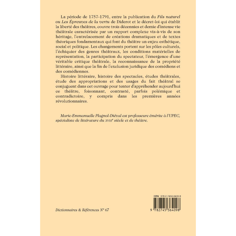 La période de 1757-1791, entre la publication du Fils naturel ou Les Épreuves de la vertu de Diderot et le décret-loi qui établit la liberté des théâtres, couvre trois décennies et demie d’intense vie théâtrale caractérisée par un rapport complexe vis-à-vis de son héritage, l’entrelacement de créations dramatiques et de textes théoriques fondamentaux qui font du théâtre un enjeu esthétique, social et politique. Les changements portent sur les pôles culturels, l’échiquier des genres théâtraux, les conditions matérielles de représentation, la participation du spectateur, l’émergence d’une véritable critique théâtrale, la reconnaissance de la propriété littéraire, ainsi que la fin de l’exclusion juridique des comédiens et des comédiennes.