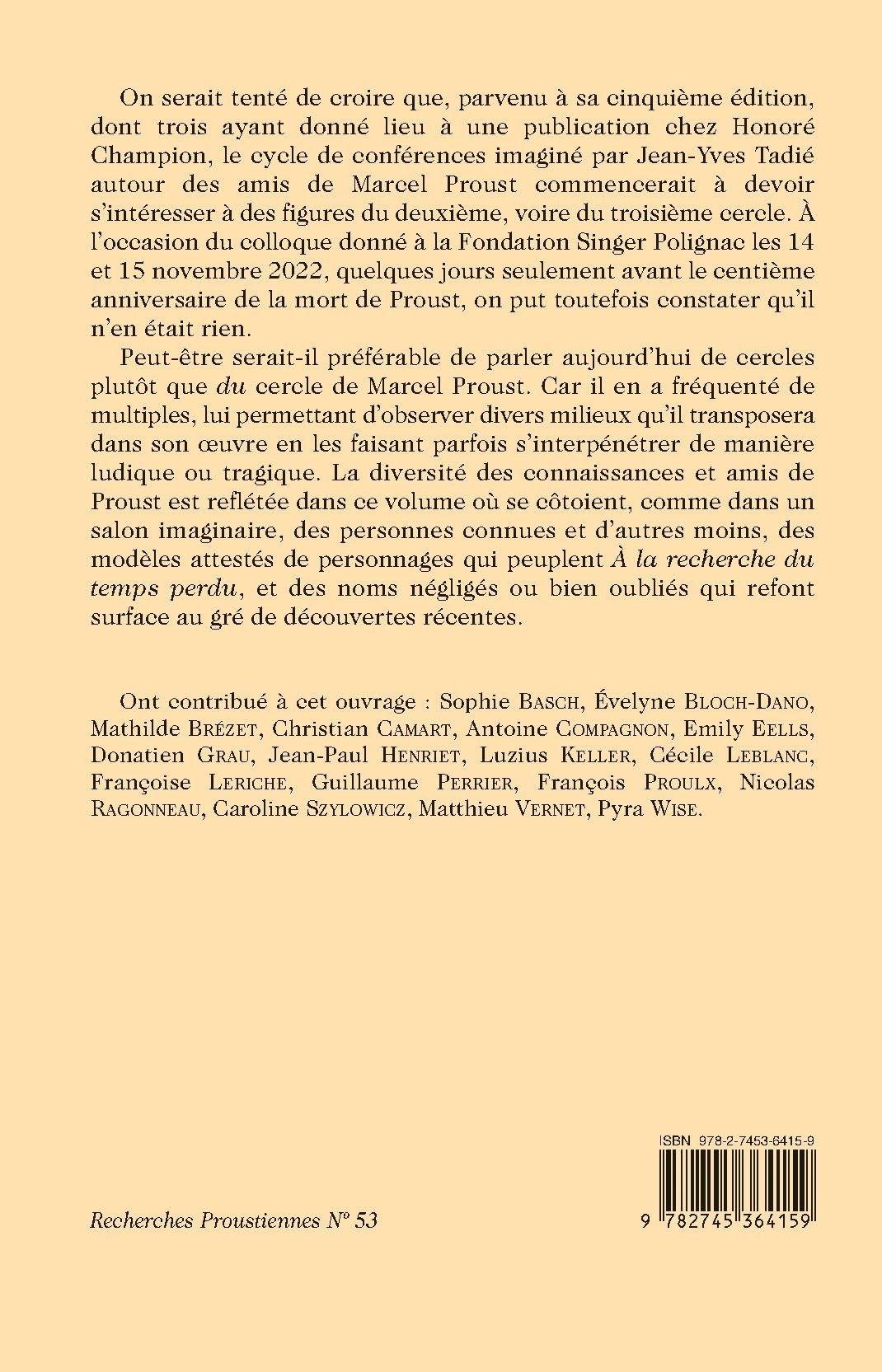 Peut-être serait-il préférable de parler aujourd’hui de cercles plutôt que du cercle de Marcel Proust. Car il en a fréquenté de multiples, lui permettant d’observer divers milieux qu’il transposera dans son oeuvre en les faisant parfois s’interpénétrer de manière ludique ou tragique. La diversité des connaissances et amis de Proust est reflétée dans ce volume où se côtoient, comme dans un salon imaginaire, des personnes connues et d’autres moins, des modèles attestés de personnages qui peuplent À la recherche du temps perdu, et des noms négligés ou bien oubliés qui refont surface au gré de découvertes récentes.