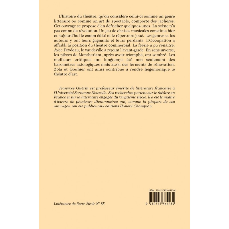 L’histoire du théâtre, qu’on considère celui-ci comme un genre littéraire ou comme un art du spectacle, comporte des jachères. Cet ouvrage se propose d’en défricher quelques-unes. La scène n’a pas connu de révolution. Un jeu de chaises musicales constitue hier et aujourd’hui le canon édité et le répertoire joué. Les genres et les auteurs y ont leurs gagnants et leurs perdants. L’Occupation a affaibli la position du théâtre commercial. La féerie a pu renaitre. Avec Feydeau, le vaudeville a rejoint l’avant-garde. En sens inverse, les pièces de Montherlant, après avoir triomphé, ont sombré. Les meilleurs critiques ont longtemps été non seulement des baromètres axiologiques mais aussi des ferments de rénovation. Zola et Gouhier ont ainsi contribué à rendre hégémonique le théâtre d’art.