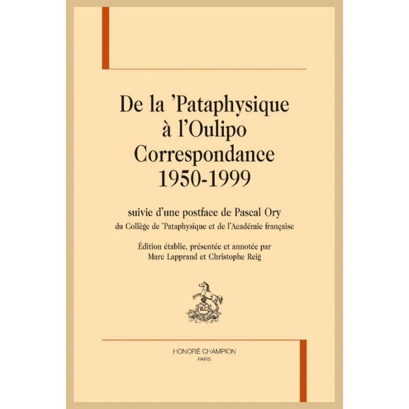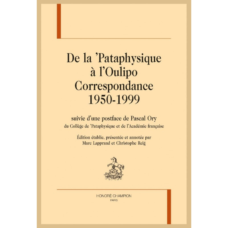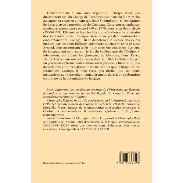 Contrairement à une idée répandue, l’Oulipo n’est pas directement issu du Collège de ’Pataphysique, mais lui fut rattaché peu après sa création en tant que Sous-Commission à l’instigation de Latis et avec l’approbation de Queneau. Cette correspondance, particulièrement dense entre 1950 et 1970 couvre un demi-siècle (1950-1999). Elle met en lumière à la fois la filiation et la proximité des deux institutions. L’Oulipo naissant compte dix membres dont cinq émanent du Collège. On se délectera à la lecture des joutes menées par les deux brillants épistoliers qu’étaient Latis et Noël Arnaud, souvent croisant le fer – non sans rire sous cape. Les jeux de langage, qui sont autant le lot du Collège que de l’Oulipo, y foisonnent dans chaque lettre, entraînant les Queneau, Le Lionnais, Bens, Ferry, Fleury, Gayot dans une joyeuse sarabande… Si le Collège brille par un protocole extrêmement élaboré sur le plan de la hiérarchie, des décorations et autres dénominations, tandis que l’Oulipo en est totalement exempt, il n’en reste pas moins que ces deux institutions se rapprochent singulièrement dans leur quête et l’exploration de la potentialité du langage.