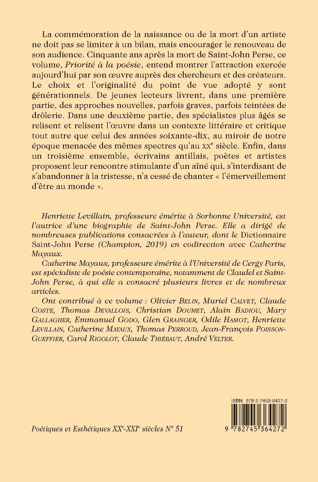 La commémoration de la naissance ou de la mort d’un artiste ne doit pas se limiter à un bilan, mais encourager le renouveau de son audience. Cinquante ans après la mort de Saint-John Perse, ce volume, Priorité à la poésie, entend montrer l’attraction exercée aujourd’hui par son œuvre auprès des chercheurs et des créateurs. Le choix et l’originalité du point de vue adopté y sont générationnels. De jeunes lecteurs livrent, dans une première partie, des approches nouvelles, parfois graves, parfois teintées de drôlerie. Dans une deuxième partie, des spécialistes plus âgés se relisent et relisent l’œuvre dans un contexte littéraire et critique tout autre que celui des années soixante-dix, au miroir de notre époque menacée des mêmes spectres qu’au XXe siècle. Enfin, dans un troisième ensemble, écrivains antillais, poètes et artistes proposent leur rencontre stimulante d’un aîné qui, s’interdisant de s’abandonner à la tristesse, n’a cessé de chanter « l’émerveillement d’être au monde ».