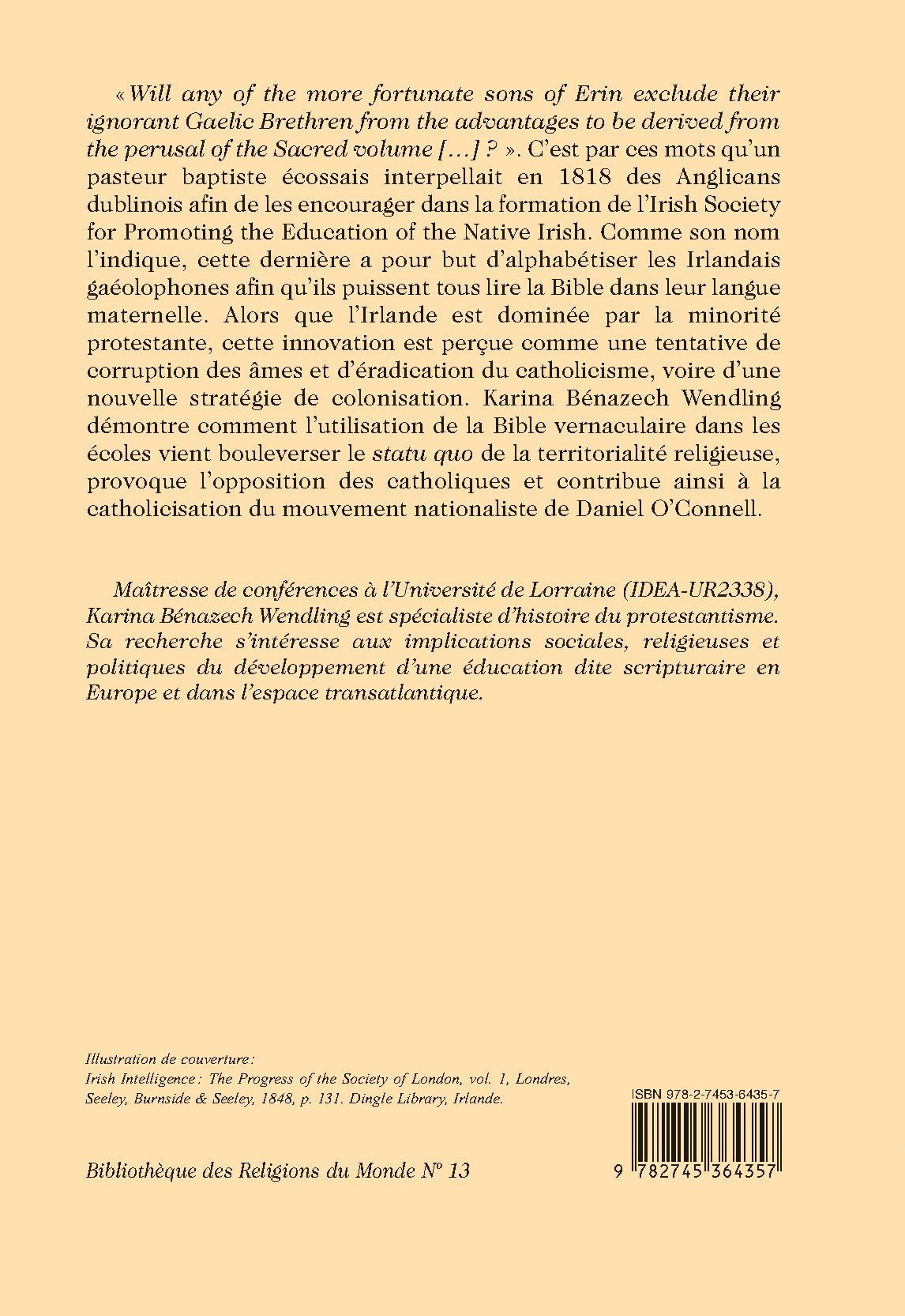 «Will any of the more fortunate sons of Erin exclude their ignorant Gaelic Brethren from the advantages to be derived from the perusal of the Sacred volume […] ? ». C’est par ces mots qu’un pasteur baptiste écossais interpellait en 1818 des Anglicans dublinois afin de les encourager dans la formation de l’Irish Society for Promoting the Education of the Native Irish. Comme son nom l’indique, cette dernière a pour but d’alphabétiser les Irlandais gaéolophones afin qu’ils puissent tous lire la Bible dans leur langue maternelle. Alors que l’Irlande est dominée par la minorité protestante, cette innovation est perçue comme une tentative de corruption des âmes et d’éradication du catholicisme, voire d’une nouvelle stratégie de colonisation. Karina Bénazech Wendling démontre comment l’utilisation de la Bible vernaculaire dans les écoles vient bouleverser le statu quo de la territorialité religieuse, provoque l’opposition des catholiques et contribue ainsi à la catholicisation du mouvement nationaliste de Daniel O’Connell.