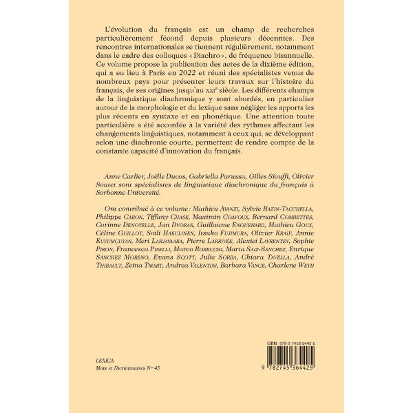 L’évolution du français est un champ de recherches particulièrement fécond depuis plusieurs décennies. Des rencontres internationales se tiennent régulièrement, notamment dans le cadre des colloques « Diachro », de fréquence bisannuelle. Ce volume propose la publication des actes de la dixième édition, qui a eu lieu à Paris en 2022 et réuni des spécialistes venus de nombreux pays pour présenter leurs travaux sur l’histoire du français, de ses origines jusqu’au XXIe siècle. Les différents champs de la linguistique diachronique y sont abordés, en particulier autour de la morphologie et du lexique sans négliger les apports les plus récents en syntaxe et en phonétique. Une attention toute particulière a été accordée à la variété des rythmes affectant les changements linguistiques, notamment à ceux qui, se développant selon une diachronie courte, permettent de rendre compte de la constante capacité d’innovation du français.