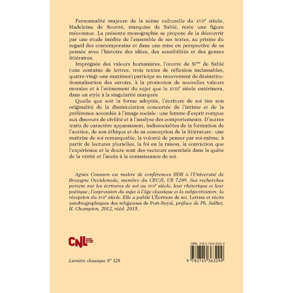Agnès Cousson est maître de conférences HDR à l’Université de Bretagne Occidentale, membre du CECJI, UR 7289. Ses recherches portent sur les écritures de soi au XVIIe siècle, leur rhétorique et leur poétique ; l’expression du sujet à l’âge classique et la subjectivation ; la réception du XVIIe siècle. Elle a publié L’Écriture de soi. Lettres et récits autobiographiques des religieuses de Port-Royal, préface de Ph. Sellier, H. Champion, 2012, rééd. 2015.