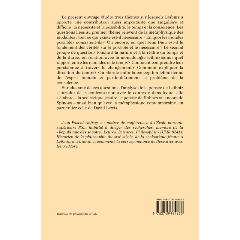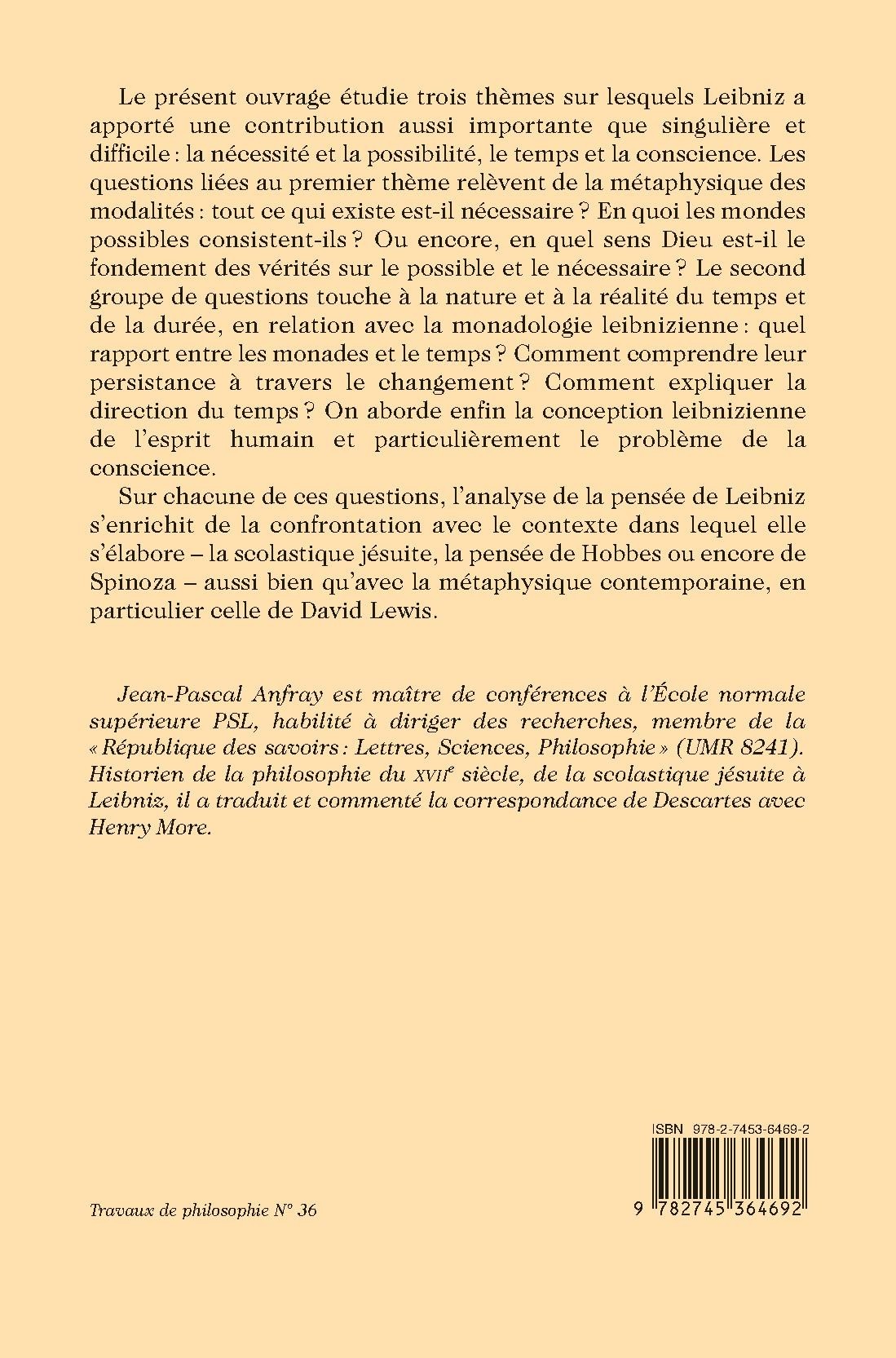 Le présent ouvrage étudie trois thèmes sur lesquels Leibniz a apporté une contribution aussi importante que singulière et difficile : la nécessité et la possibilité, le temps et la conscience. Les questions liées au premier thème relèvent de la métaphysique des modalités : tout ce qui existe est-il nécessaire ? En quoi les mondes possibles consistent-ils ? Ou encore, en quel sens Dieu est-il le fondement des vérités sur le possible et le nécessaire ? Le second groupe de questions touche à la nature et à la réalité du temps et de la durée, en relation avec la monadologie leibnizienne : quel rapport entre les monades et le temps ? Comment comprendre leur persistance à travers le changement ? Comment expliquer la direction du temps ? On aborde enfin la conception leibnizienne de l’esprit humain et particulièrement le problème de la conscience.