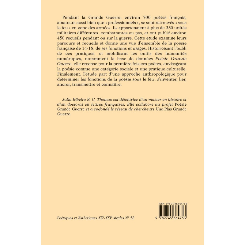 Pendant la Grande Guerre, environ 700 poètes français, amateurs aussi bien que « professionnels », se sont retrouvés « sous le feu » en zone des armées. Ils appartenaient à plus de 350 unités militaires différentes, combattantes ou pas, et ont publié environ 450 recueils pendant ou sur la guerre. Cette étude examine leurs parcours et recueils et donne une vue d’ensemble de la poésie française de 14-18, de ses fonctions et usages. Historicisant l’oubli de ces pratiques, et mobilisant les outils des humanités numériques, notamment la base de données Poésie Grande Guerre, elle recense pour la première fois ces poètes, envisageant la poésie comme une catégorie sociale et une pratique culturelle. Finalement, l’étude part d’une approche anthropologique pour déterminer les fonctions de la poésie sous le feu : s’inventer, lier, ancrer, transmettre et connaître.