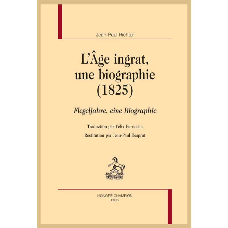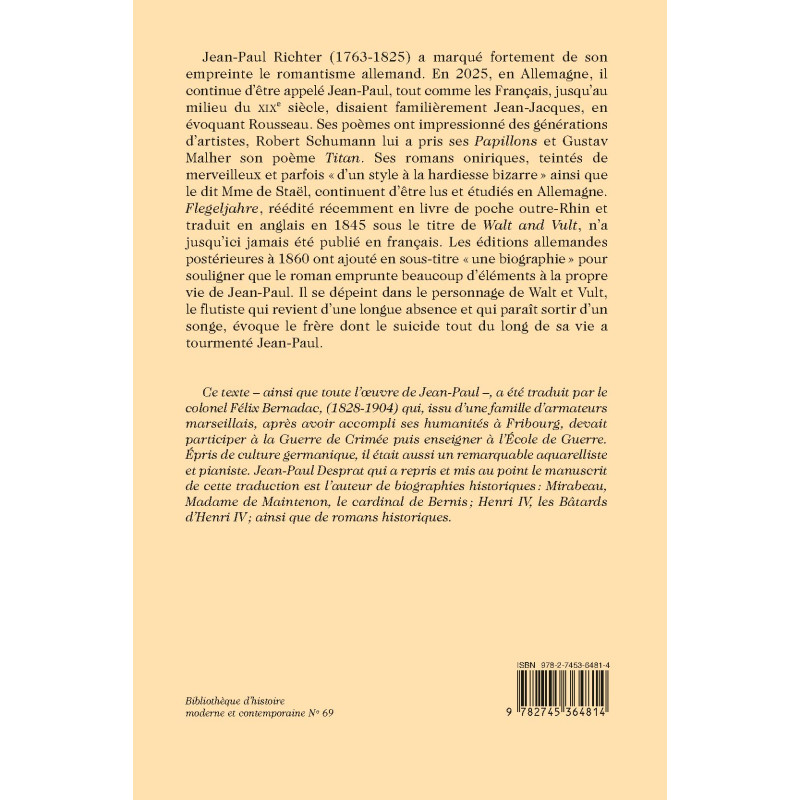 Jean-Paul Richter (1763-1825) a marqué fortement de son empreinte le romantisme allemand. En 2025, en Allemagne, il continue d’être appelé Jean-Paul, tout comme les Français, jusqu’au milieu du XIXe siècle, disaient familièrement Jean-Jacques, en évoquant Rousseau. Ses poèmes ont impressionné des générations d’artistes, Robert Schumann lui a pris ses Papillons et Gustav Malher son poème Titan. Ses romans oniriques, teintés de merveilleux et parfois « d’un style à la hardiesse bizarre » ainsi que le dit Mme de Staël, continuent d’être lus et étudiés en Allemagne. Flegeljahre, réédité récemment en livre de poche outre-Rhin et traduit en anglais en 1845 sous le titre de Walt and Vult, n’a jusqu’ici jamais été publié en français. Les éditions allemandes postérieures à 1860 ont ajouté en sous-titre « une biographie » pour souligner que le roman emprunte beaucoup d’éléments à la propre vie de Jean-Paul. Il se dépeint dans le personnage de Walt et Vult, le flutiste qui revient d’une longue absence et qui paraît sortir d’un songe, évoque le frère dont le suicide tout du long de sa vie a tourmenté Jean-Paul.
