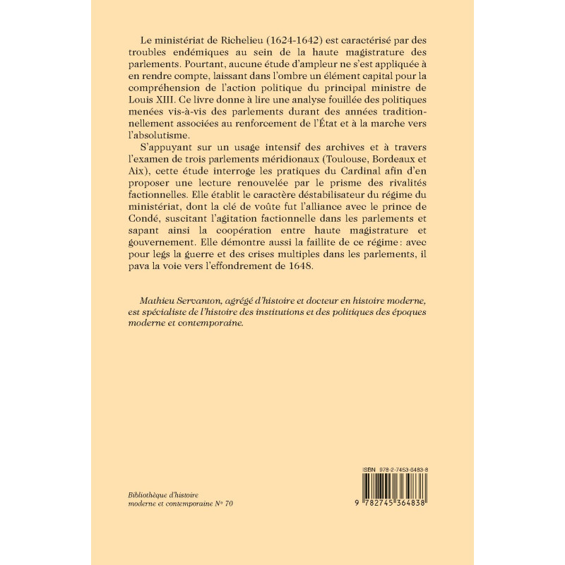 Le ministériat de Richelieu (1624-1642) est caractérisé par des troubles endémiques au sein de la haute magistrature des parlements. Pourtant, aucune étude d’ampleur ne s’est appliquée à en rendre compte, laissant dans l’ombre un élément capital pour la compréhension de l’action politique du principal ministre de Louis XIII. Ce livre donne à lire une analyse fouillée des politiques menées vis-à-vis des parlements durant des années tradition - nellement associées au renforcement de l’État et à la marche vers l’absolutisme.