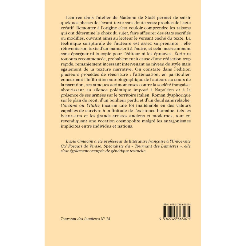 L’entrée dans l’atelier de Madame de Staël permet de saisir quelques phases de l’avant-texte sans doute assez proches de l’acte créatif. Remonter à l’origine c’est vouloir comprendre les raisons qui ont déterminé le choix du sujet, faire affleurer des états sacrifiés ou modifiés, ouvrant ainsi au lecteur le versant caché du texte. La technique scripturale de l’auteure est assez surprenante : elle réinvente son texte d’un manuscrit à l’autre, et cela incessamment sans épargner ni la copie pour l’éditeur ni les épreuves. Écriture toujours recommencée, probablement à cause d’une rédaction trop rapide, remaniement incessant intervenant au niveau du style mais également de la texture narrative. On constate dans l’édition plusieurs procédés de réécriture : l’atténuation, en particulier, concernant l’infiltration autobiographique de l’auteure au cours de la narration, ses attaques acrimonieuses contre la société française, aboutissant au silence polémique imposé à Napoléon et à la présence de ses armées sur le territoire italien. Roman dysphorique sur le plan du récit, d’un bonheur perdu et d’un deuil sans relâche, Corinne ou l’Italie incarne une foi inaliénable en des valeurs capables de survivre à la finitude de l’existence humaine, tels les beaux-arts et les grands artistes anciens et modernes, tout en revendiquant une vocation cosmopolite malgré les antagonismes implicites entre individus et nations.