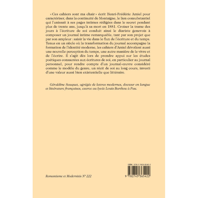 « Ces cahiers sont ma chair » écrit Henri-Frédéric Amiel pour caractériser, dans la continuité de Montaigne, le lien consubstantiel qui l’unissait à ses pages intimes rédigées dans le secret pendant plus de trente ans, jusqu’à sa mort en 1881. Croiser la trame des jours à l’écriture de soi conduit ainsi le diariste genevois à composer un journal intime remarquable, tant par son projet que par son ampleur : saisir la vie dans le flux de l’écriture et du temps. Tenus en un siècle où la transformation du journal accompagne la formation de l’identité moderne, les cahiers d’Amiel dévoilent aussi une nouvelle perception du temps, une autre manière de le vivre et de l’écrire. Il s’agit dès lors de prendre appui sur les études poétiques consacrées aux écritures de soi, en particulier au journal personnel, pour rendre compte d’un journal-oeuvre considéré comme le modèle du genre, un récit de soi au long cours, investi d’une valeur aussi bien existentielle que littéraire.