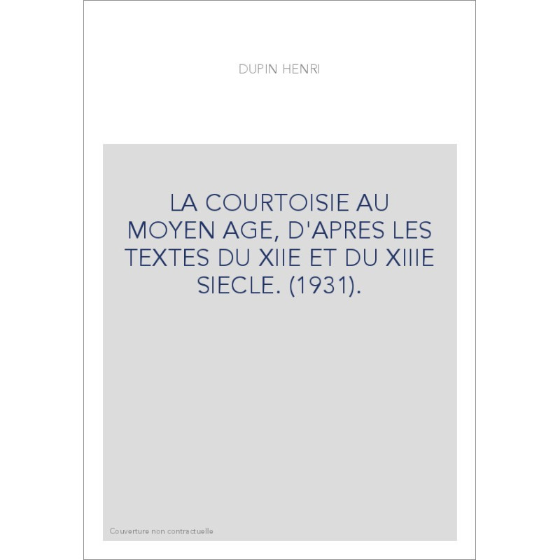 LA COURTOISIE AU MOYEN AGE, D'APRES LES TEXTES DU XIIE ET DU XIIIE SIECLE. (1931).
