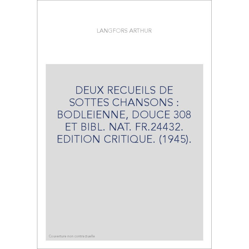 DEUX RECUEILS DE SOTTES CHANSONS : BODLEIENNE, DOUCE 308 ET BIBL. NAT. FR.24432. EDITION CRITIQUE. (1945).