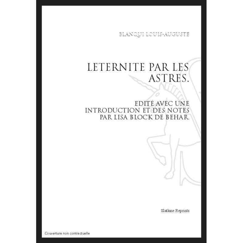 Moins connues que les violentes critiques de ses écrits politiques et de ses conspirations révolutionnaires, L'Éternité par les astres, de Louis-Auguste Blanqui propose une réflexion poétique d'une étrange actualité. Publié en 1872, écrit en prison où il fut longtemps enfermé, ce texte qui imagine une éternité insolite par la multiplication de mondes, a joué un rôle déterminant dans la pensée de Walter Benjamin et - ce qui est le plus étonnant - dans les fictions qui ont défini l'univers littéraire de J. L. Borges et Bioy Casères. Formulées comme une " hypothèse astronomiques ", ces énigmatiques conjectures scientifiques de Blanqui, plus que les insurrections qu'il avait provoquées, rachètent les sens d'une " révolution " qui atteint une vigueur inattendue. Pour réaliser cette nouvelle édition, et suivant le même procédé que l'auteur, Lisa Block de Behar est partie de la première édition de février 1872, en tenant compte des amendements et ajouts, ainsi que de la disposition différente adoptée par Blanqui en prison pour la réorganiser, quand il envisageait encore la possibilité de publier une seconde édition. Parmi les modifications, et en accord avec ses instructions, elle a inclus un appendice manuscrit intitulé " Sur l'enseignement de la cosmographie ", jamais publié jusqu'à présent.