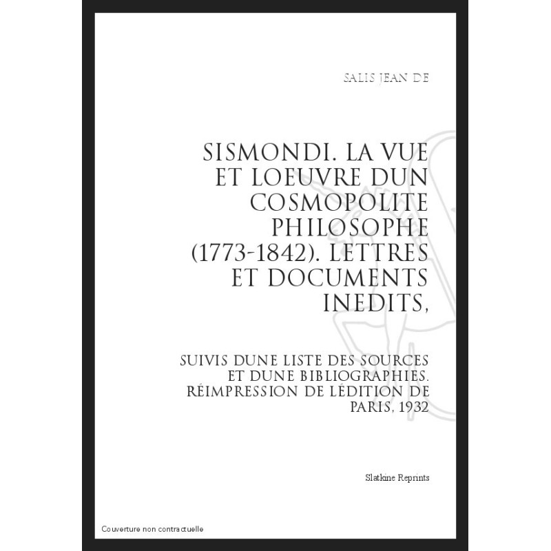 This work by Jean de Salis, re-issued to mark the bicentenary of Sismondi’s birth, remains today unrivalled as a comprehensive study on the life and works of that young sentimental writer, the initiator and innovator whose productions have long since been the object of contemporary commentators.