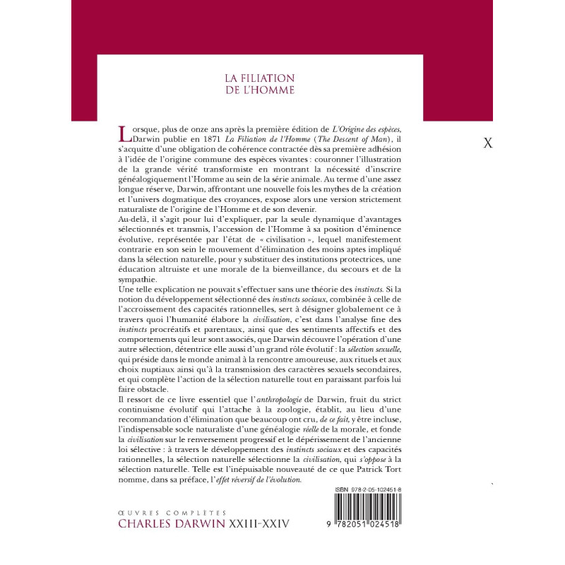 This volume of the complete works of Charles Darwin includes the French translation of Darwin’s work La Filiation de l’Homme (The Descent of Man) first published in 1871. It treats evolutionary theory applied to human evolution and details Darwin’s theory of sexual selection. The translation is followed by an essay by Patrick Tort called L’anthropologie inattendue de Charles Darwin.