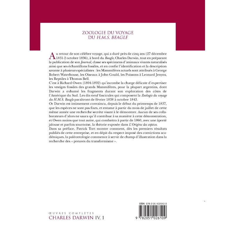 C’est à Richard Owen (1804-1892) qu’incombe la charge délicate d’expertiser les vestiges fossiles des grands Mammifères, pour la plupart argentins, dont Darwin a exhumé les fragments durant son exploration des côtes de l’Amérique du Sud. Les dix-neuf fascicules qui composent la « Zoologie du voyage du H.M.S. Beagle » paraîtront de février 1838 à octobre 1843.