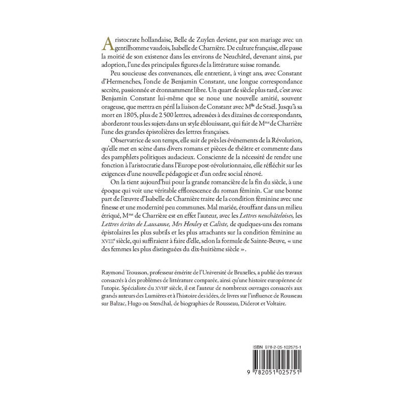 Aristocrate hollandaise, Belle de Zuylen devient, par son mariage avec un gentilhomme vaudois, Isabelle de Charnière. De culture française, elle passe la moitié de son existence dans les environs de Neuchâtel, devenant ainsi, par adoption, l’une des principales figures de la littérature suisse romande. Peu soucieuse des convenances, elle entretient, à vingt ans, avec Constant d’Hermenches, l’oncle de Benjamin Constant, une longue correspondance secrète, passionnée et étonnamment libre. Un quart de siècle plus tard, c’est avec Benjamin Constant lui-même que se noue une nouvelle amitié, souvent orageuse, que mettra en péril la liaison de Constant avec Mlle de Staël. Jusqu’à sa mort en 1805, plus de 2 500 lettres, adressées à des dizaines de correspondants, aborderont tous les sujets dans un style éblouissant, qui fait de Mme de Charrière l’une des grandes épistolières des lettres françaises. Observatrice de son temps, elle suit de près les événements de la Révolution, qu’elle met en scène dans divers romans et pièces de théâtre et commente dans des pamphlets politiques audacieux. Consciente de la nécessité de rendre une fonction à l’aristocratie dans l’Europe post-révolutionnaire, elle réfléchit sur les exigences d’une nouvelle pédagogie et d’un ordre social rénové. On la tient aujourd’hui pour la grande romancière de la fin du siècle, à une époque qui voit une véritable efflorescence du roman féminin. Car une bonne part de l’œuvre d’Isabelle de Charnière traite de la condition féminine avec une finesse et une modernité peu communes. Mal mariée, étouffant dans un milieu étriqué, Mme de Charrière est en effet l’auteur, avec les « Lettres neuchâteloises », les « Lettres écrites de Lausanne, Mrs Henley et Caliste », de quelques-uns des romans épistolaires les plus subtils et les plus attachants sur la condition féminine au XVIIIe siècle, qui suffiraient à faire d’elle, selon la formule de Sainte-Beuve, «une des femmes les plus distinguées du dix-huitièème siècle».