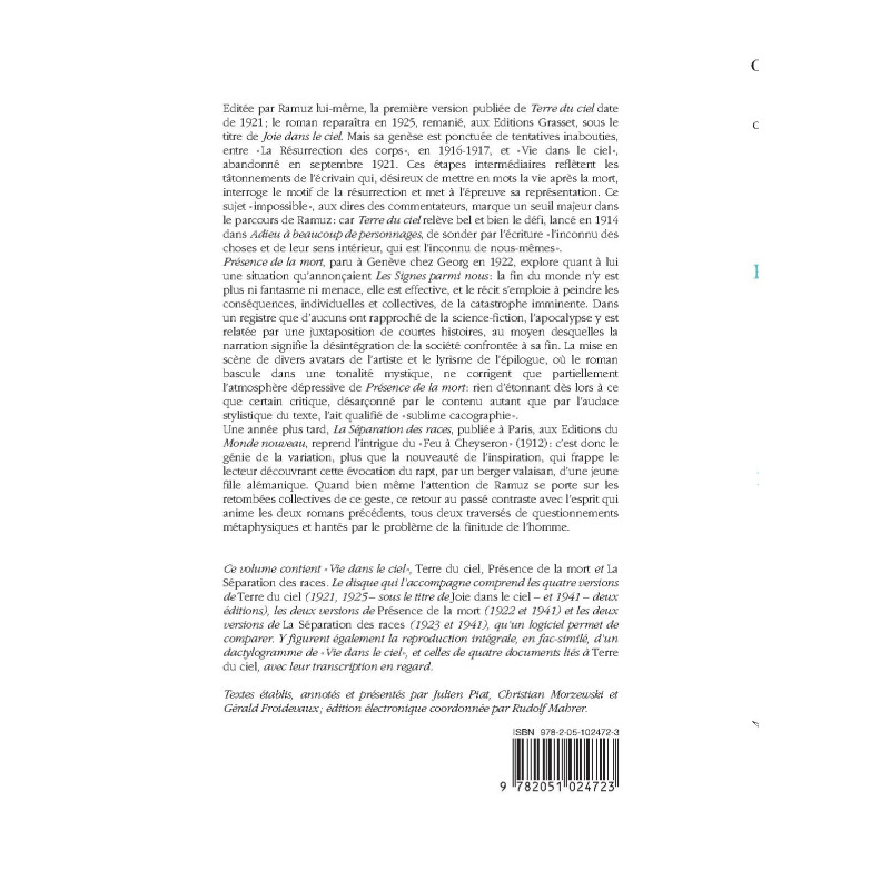 Éditée par Ramuz lui-même, la première version publiée de Terre du ciel date de 1921; le roman reparaîtra en 1925, remanié, aux Éditions Grasset, sous le titre de Joie dans le ciel. Mais sa genèse est ponctuée de tentatives inabouties, entre «La Résurrection des corps», en 1916-1917, et «Vie dans le ciel», abandonné en septembre 1921. Ces étapes intermédiaires reflètent les tâtonnements de l’écrivain qui, désireux de mettre en mots la vie après la mort, interroge le motif de la résurrection et met à l’épreuve sa représentation. Ce sujet « impossible», aux dires des commentateurs, marque un seuil majeur dans le parcours de Ramuz: car Terre du ciel relève bel et bien le défi, lancé en 1914 dans Adieu à beaucoup de personnages, de sonder par l’écriture «l’inconnu des choses et de leur sens intérieur, qui est l’inconnu de nous-mêmes». Présence de la mort, paru à Genève chez Georg en 1922, explore quant à lui une situation qu’annonçaient Les Signes parmi nous: la fin du monde n’y est plus ni fantasme ni menace, elle est effective, et le récit s’emploie à peindre les conséquences, individuelles et collectives, de la catastrophe imminente. Dans un registre que d’aucuns ont rapproché de la science-fiction, l’apocalypse y est relatée par une juxtaposition de courtes histoires, au moyen desquelles la narration signifie la désintégration de la société confrontée à sa fin. La mise en scène de divers avatars de l’artiste et le lyrisme de l’épilogue, où le roman bascule dans une tonalité mystique, ne corrigent que partiellement l’atmosphère dépressive de Présence de la mort: rien d’étonnant dès lors à ce que certain critique, désarçonné par le contenu autant que par l’audace stylistique du texte, l’ait qualifié de «sublime cacographie». (...)