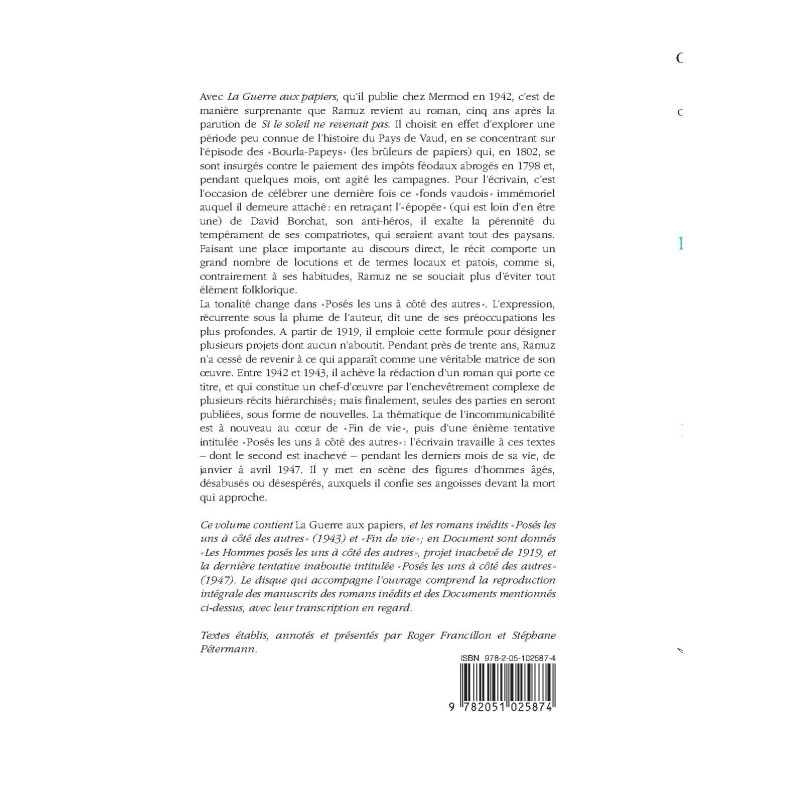 Ce volume contient La Guerre aux papiers, et les romans inédits « Posés les uns à côté des autres » (1943) et « Fin de vie » ; en Document sont donnés « Les Hommes posés les uns à côté des autres », projet inachevé de 1919, et la dernière tentative inaboutie intitulée « Posés les uns à côté des autres » (1947). Le disque qui accompagne l’ouvrage comprend la reproduction intégrale des manuscrits des romans inédits et des Documents mentionnés ci-dessus, avec leur transcription en regard.