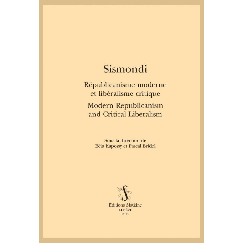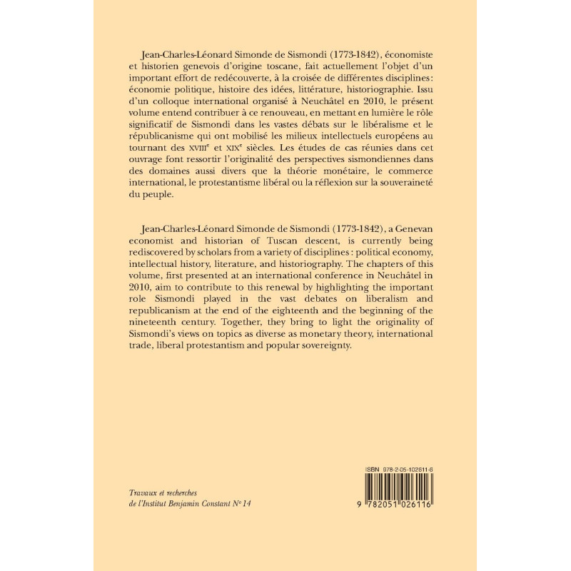 Jean-Charles-Léonard Simonde de Sismondi (1773-1842), a Genevan economist and historian of Tuscan descent, is currently being rediscovered by scholars from a variety of disciplines : political economy, intellectual history, literature, and historiography. The chapters of this volume, first presented at an international conference in Neuchâtel in 2010, aim to contribute to this renewal by highlighting the important role Sismondi played in the vast debates on liberalism and republicanism at the end of the eighteenth and the beginning of the nineteenth century. Together, they bring to light the originality of Sismondi’s views on topics as diverse as monetary theory, international trade, liberal protestantism and popular sovereignty.