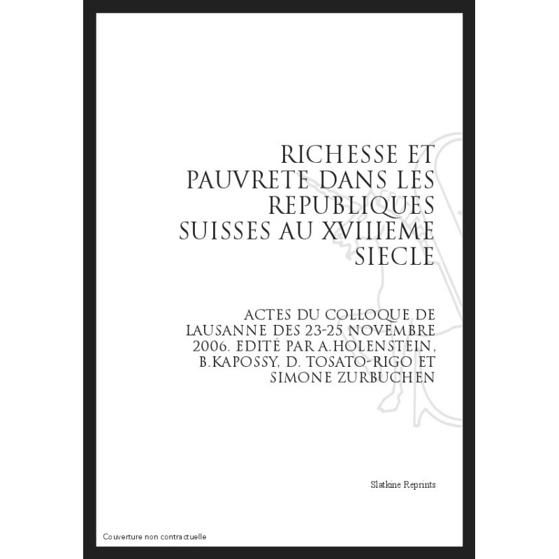 Ce volume réunit une vingtaine de contributions de différentes disciplines présentées au colloque international Richesse et pauvreté dans les Républiques suisses organisé à l'université de Lausanne en novembre 2006. Placé sous l'égide de la Société suisse pour l'étude du XVIIIe siècle, ce dernier a été mis sur pied à l'initiative d'historiens des idées et d'historiens s'intéressant aux pratiques politiques, socio-économiques et culturelles dans l'Ancienne Confédération. Sans rechercher l'exhaustivité, ce colloque a mis l'accent, plutôt que sur deux situations au caractère antithétique, sur un binôme problématique: conçues dans un rapport dialectique, richesse et pauvreté renvoient au final à l'inégale répartition des ressources et aux tensions qui l'habitent. Des tensions que le flot d'écrits consacrés à l'époque des Lumières à la question de la pauvreté traduisent de manière éloquente. Qu'elles soient générées par des changements économiques structurels ou conjoncturels, des variations de niveaux de vie, la mobilité sociale, une crise (celle de 1770/71 par exemple), par le développement d'une économie marchande englobant les campagnes, par la mise en péril de l'équilibre bourgeois-habitants, mais aussi par des changements culturels - impact des idées des Lumières, laïcisation de la société -, ces tensions suscitent des interrogations qui ont constitué le fil rouge de ce colloque, et la matière à plusieurs de ses discussions, réparties en cinq volets: I. Les républiques suisses et leurs pauvres, II. Du luxe monarchique à la frugalité républicaine, III. Au-delà du luxe et de la charité, IV. Assistance et concepts éducatifs, V. Solidarité et distinction.