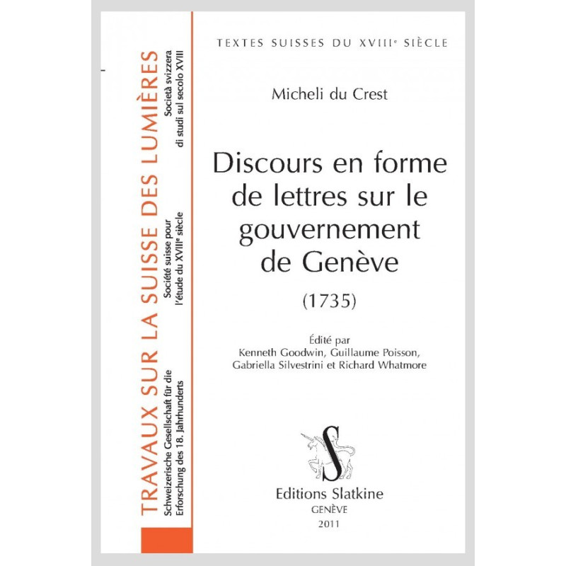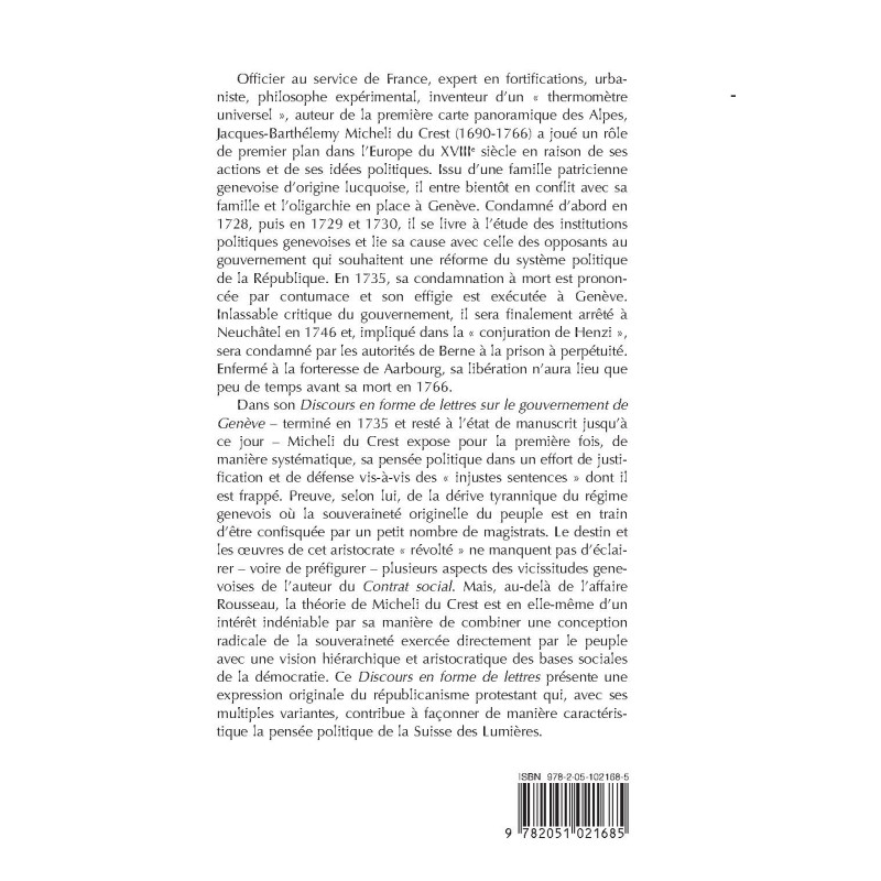 This study deals with Jacques-Barthélemy Micheli du Crest (September 28, 1690 – March 29, 1766), a Genevan military engineer, physicist and cartographer. Born into the aristocracy, he eventually fled to France as an enemy of Geneva. It focuses in particular on Du Crest’s work Discours en forme de lettres sur le gouvernement de Genève (1735), which exposes for the first time his political thinking.