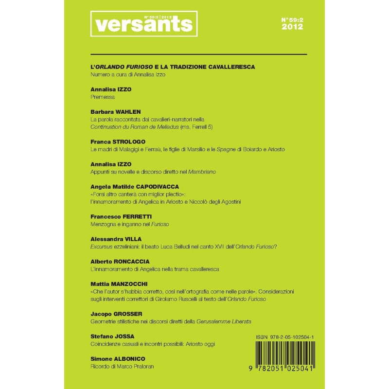 L’ORLANDO FURIOSO E LA TRADIZIONE CAVALLERESCA Numero a cura di Annalisa Izzo Annalisa IZZO Premessa Barbara WAHLEN La parola raccontata dai cavalieri-narratori nella Continuation du Roman de Meliadus (ms. Ferrell 5) Franca STROLOGO Le madri di Malagigi e Ferraù, le fi glie di Marsilio e le Spagne di Boiardo e Ariosto Annalisa IZZO Appunti su novelle e discorso diretto nel Mambriano Angela Matilde CAPODIVACCA «Forsi altro canterà con miglior plectio»: l’innamoramento di Angelica in Ariosto e Niccolò degli Agostini Francesco FERRETTI Menzogna e inganno nel Furioso Alessandra VILLA Excursus ezzeliniani: il beato Luca Belludi nel canto XVII dell’Orlando Furioso? Alberto RONCACCIA L’innamoramento di Angelica nella trama cavalleresca Mattia MANZOCCHI «Che l’autor s’habbia corretto, così nell’ortografi a come nelle parole». Considerazioni sugli interventi correttori di Girolamo Ruscelli al testo dell’Orlando Furioso Jacopo GROSSER Geometrie stilistiche nei discorsi diretti della Gerusalemme Liberata Stefano JOSSA Coincidenze casuali e incontri possibili: Ariosto oggi Simone ALBONICO Ricordo di Marco Praloran