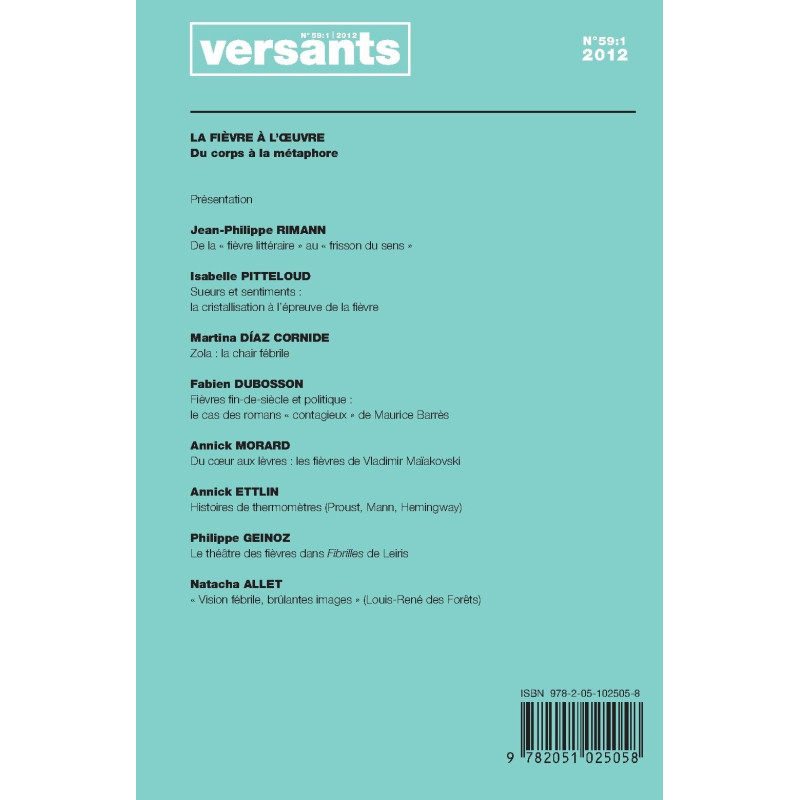 LA FIÈVRE À L’OEUVRE Du corps à la métaphore Présentation Jean-Philippe RIMANN De la « fièvre littéraire » au « frisson du sens » Isabelle PITTELOUD Sueurs et sentiments : la cristallisation à l’épreuve de la fièvre Martina DÍAZ CORNIDE Zola : la chair fébrile Fabien DUBOSSON Fièvres fi n-de-siècle et politique : le cas des romans « contagieux » de Maurice Barrès Annick MORARD Du cœur aux lèvres : les fièvres de Vladimir Maïakovski Annick ETTLIN Histoires de thermomètres (Proust, Mann, Hemingway) Philippe GEINOZ Le théâtre des fièvres dans Fibrilles de Leiris Natacha ALLET « Vision fébrile, brûlantes images » (Louis-René des Forêts)