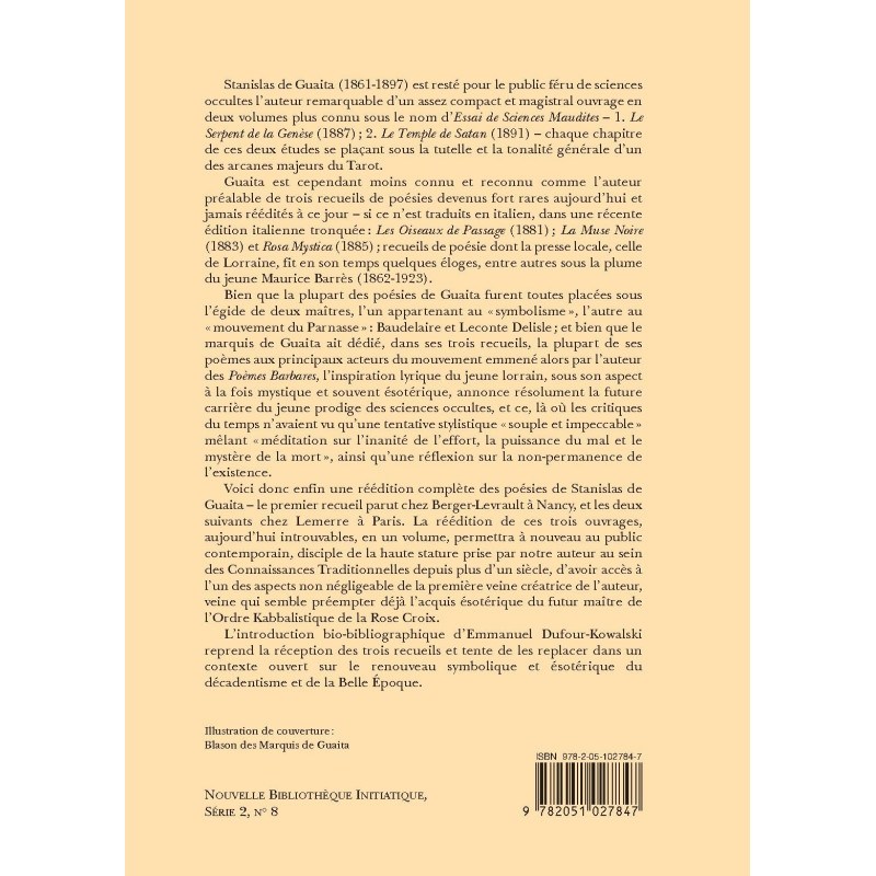 Voici donc enfin une réédition complète des poésies de Stanislas de Guaita – le premier recueil parut chez Berger-Levrault à Nancy, et les deux suivants chez Lemerre à Paris. La réédition de ces trois ouvrages, aujourd’hui introuvables, en un volume permettra à nouveau au public contemporain, disciple de la haute stature prise par notre auteur au sein des Connaissances Traditionnelles depuis plus d’un siècle, d’avoir accès à l’un des aspects non négligeable de la première veine créatrice de l’auteur, veine qui semble préempter déjà l’acquis ésotérique du futur maître de l’Ordre Kabbalistique de la Rose Croix.