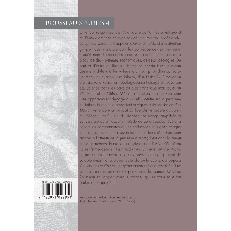 La rencontre au cœur de l’Allemagne de l’armée soviétique et de l’armée américaine avec ses alliés européens a déclenché ce qu’il est convenu d’appeler la Guerre Froide et une situation géopolitique mondiale dont les conséquences se font sentir jusqu’à nous. Le monde apparaissait sous la forme de deux blocs, de deux systèmes économiques, de deux idéologies. De part et d’autre du Rideau de fer, on construit un Rousseau destiné à défendre les valeurs d’un camp ou d’un autre. Le Rousseau d’un Jacob Leib Talmon, d’un Lester G. Crocker ou d’un Bertrand Russell est idéologiquement chargé et trouve son équivalence dans les pays du bloc soviétique mais aussi au Viêt Nam et en Chine. Même la construction d’un Rousseau lisse apparemment dégagé du conflit, centré sur la personne et l’intime, telle que la présentent quelques critiques des années 60-70, est encore un produit du libéralisme propre au camp du "Monde libre". Loin de donner une image simplifiée et caricaturale du philosophe, l’étude de cette époque révèle, à travers les commentaires ou les traductions faits dans chaque camp, une recherche assez riche autour de celui-ci. Rousseau répond à l’attente de la jeunesse d’alors ; il est dans la rue et quitte un moment le monde poussiéreux de l’université, où on l’a renfermé depuis. Il est traduit en Chine et au Viêt Nam, quand on croit encore que ces pays n’ont rien produit de valable durant la révolution culturelle ou la guerre qui opposa Vietnamiens et Chinois au géant américain et à ses alliés. Il ne se laisse réduire ou dompter par aucun des camps. C’est ce Rousseau en rapport avec le monde, qui lui parle et le fait parler, qui apparaît ici.