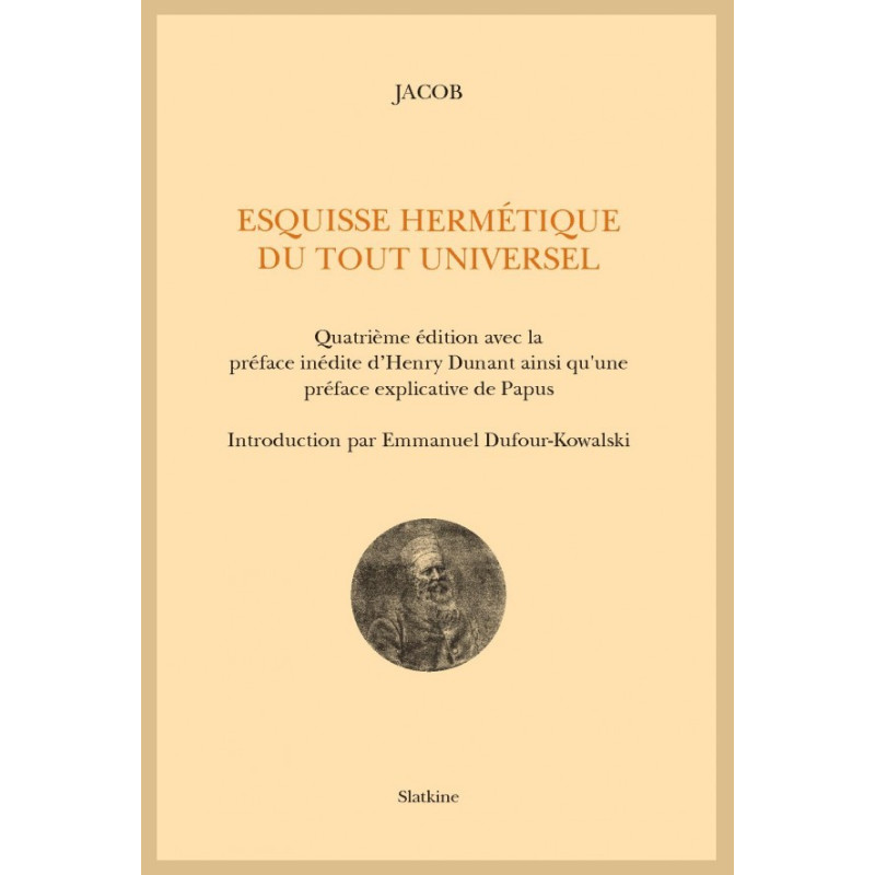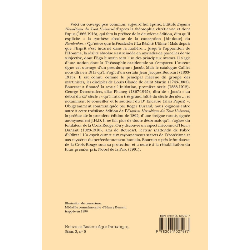 Voici un ouvrage peu commun, aujourd’hui épuisé, intitulé Esquisse Hermétique du Tout Universel d’après la théosophie chrétienne et dont Papus (1865-1916), qui fera la préface de la deuxième édition, dira qu’il explicite « la synthèse absolue de la conception [hindoue] du Parabrahm. » Qu’est-ce que le Parabrahm ? La Réalité Ultime ! Mais depuis que l’Esprit s’est incarné dans la matière… jusqu’à l’apparition de l’Homme, la réalité absolue s’est scindée en myriades de parcelles de vie subjective, dont l’Ego humain sera l’un des principaux avatars. Il s’agit d’une notion dont la Théosophie occidentale va s’emparer. L’auteur signe cet ouvrage d’un pseudonyme : Jacob. Mais le catalogue Caillet nous dira en 1913 qu’il s’agit d’un certain Jean Jacques Bourcart (1833- 1913). Il est connu comme le principal mécène du groupe des martinistes, les disciples de Louis Claude de Saint Martin (1743-1803). Bourcart a financé la revue l’Initiation, première série (1888-1912). George Descormiers, alias Phaneg (1867-1945), dira de « Jacob » au début du XXe siècle : « qu’il fut un très grand initié du siècle dernier… et notamment le conseiller et le soutient du Dr Encause (alias Papus) ». Obligeamment communiquée par Roger Durand, nous joignons entre autre à cette troisième édition de l’Esquisse Hermétique du Tout Universel, la préface de la première édition de 1892, d’une insigne rareté, signée anonymement J.H.D. Il ne fait plus de doute désormais qu’il s’agisse du fondateur de la Croix Rouge. On y découvre un aspect méconnu d’Henry Dunant (1828-1910), ami de Bourcart, lecteur inattendu de Fabre d’Olivet ! Un esprit ouvert aux rayonnements secrets de l’ésotérisme et aux mystères du perfectionnement humain. Bourcart a pris le fondateur de la Croix-Rouge sous sa protection et a œuvré à la réhabilitation du futur premier prix Nobel de la Paix (1901).