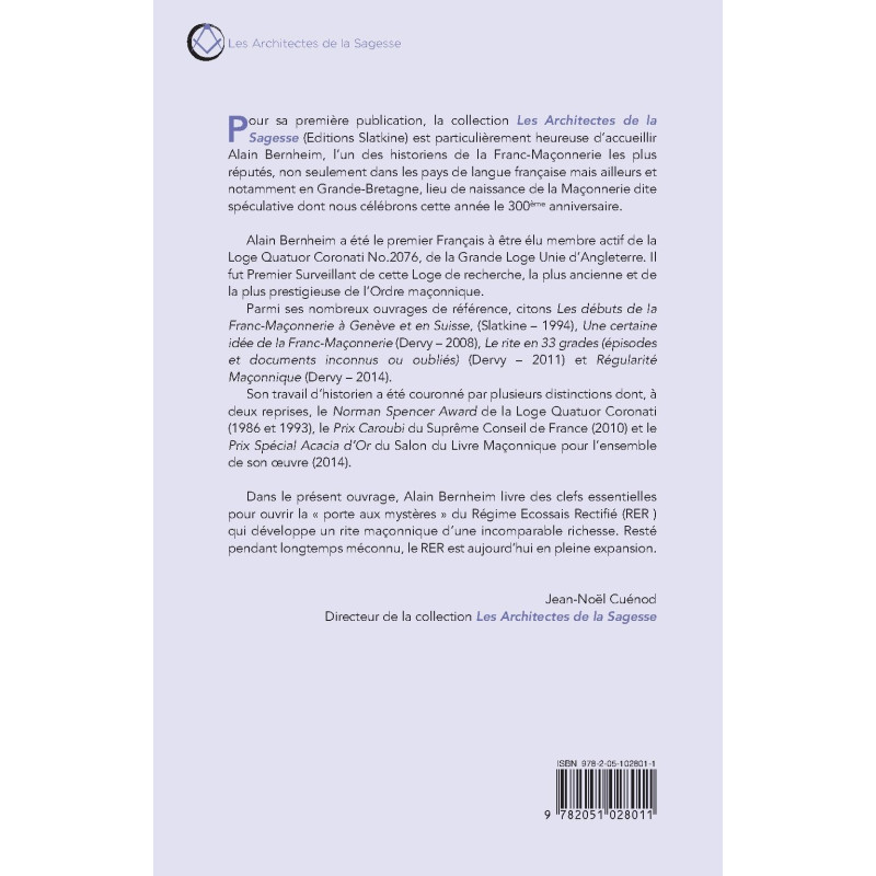 Pour sa première publication, la collection Les Architectes de la Sagesse (Editions Slatkine) est particulièrement heureuse d’accueillir Alain Bernheim, l’un des historiens de la Franc-Maçonnerie les plus réputés, non seulement dans les pays de langue française mais ailleurs et notamment en Grande-Bretagne, lieu de naissance de la Maçonnerie dite spéculative dont nous célébrons cette année le 300ème anniversaire.
