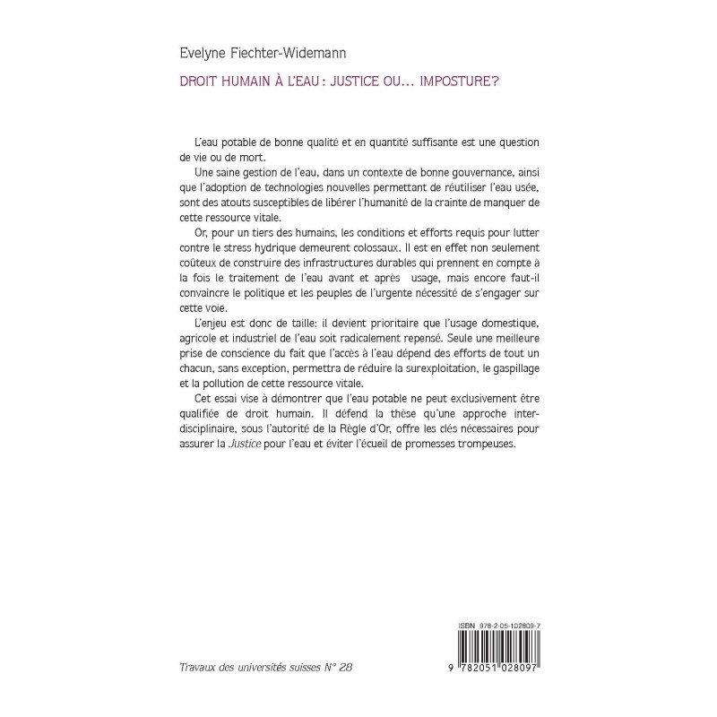 Cet essai vise à démontrer que l’eau potable ne peut exclusivement être qualifiée de droit humain. Il défend la thèse qu’une approche interdisciplinaire, sous l’autorité de la Règle d’Or, offre les clés nécessaires pour assurer la Justice pour l’eau et éviter l’écueil de promesses trompeuses.