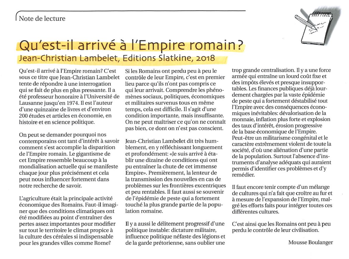 D’autres explications du déclin de l’Empire, comme par exemple un empoisonnement collectif par le plomb, une poussée irrésistible des peuples « barbares » ou l’influence débilitante du christianisme, sont examinées. La question est enfin discutée de savoir si la trajectoire de l’Empire peut comporter des enseignements pour notre propre époque.