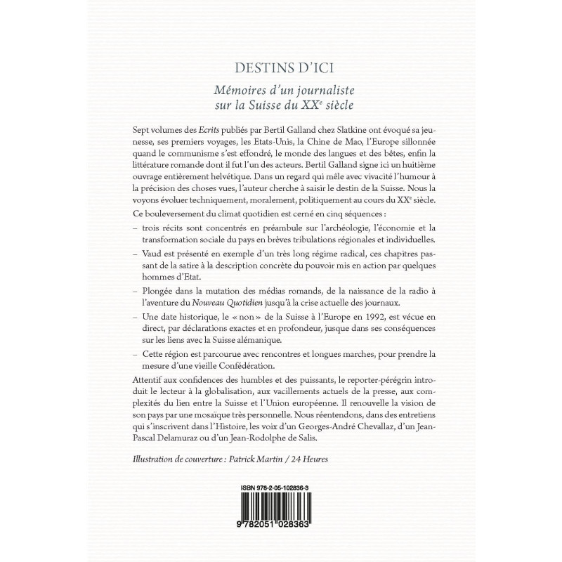 Sept volumes des Ecrits publiés par Bertil Galland chez Slatkine ont évoqué sa jeunesse, ses premiers voyages, les Etats-Unis, la Chine de Mao, l’Europe sillonnée quand le communisme s’est effondré, le monde des langues et des bêtes, enfin la littérature romande dont il fut l’un des acteurs. Bertil Galland signe ici un huitième ouvrage entièrement helvétique. Dans un regard qui mêle avec vivacité l’humour à la précision des choses vues, l’auteur cherche à saisir le destin de la Suisse. Nous la voyons évoluer techniquement, moralement, politiquement au cours du 20e siècle.