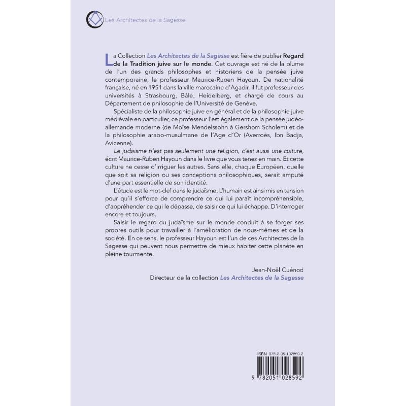 La Collection Les Architectes de la Sagesse est fière de publier Regard de la Tradition juive sur le monde. Cet ouvrage est né de la plume de l’un des grands philosophes et historiens de la pensée juive contemporaine, le professeur Maurice-Ruben Hayoun. De nationalité française, né en 1951 dans la ville marocaine d’Agadir, il fut professeur des universités à Strasbourg, Bâle, Heidelberg, et chargé de cours au Département de philosophie de l’Université de Genève.
