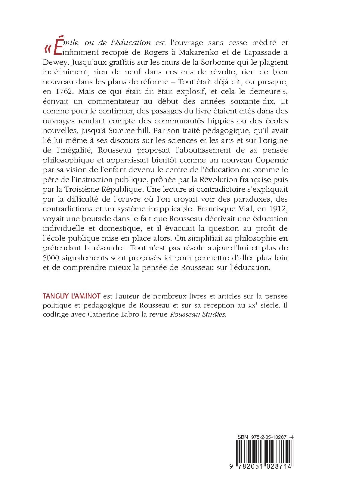 « Émile, ou de l’éducation est l’ouvrage sans cesse médité et infiniment recopié de Rogers à Makarenko et de Lapassade à Dewey. Jusqu’aux graffitis sur les murs de la Sorbonne qui le plagient indéfiniment, rien de neuf dans ces cris de révolte, rien de bien nouveau dans les plans de réforme – Tout était déjà dit, ou presque, en 1762. Mais ce qui était dit était explosif, et cela le demeure », écrivait un commentateur au début des années soixante-dix. Et comme pour le confirmer, des passages du livre étaient cités dans des ouvrages rendant compte des communautés hippies ou des écoles nouvelles, jusqu’à Summerhill. Par son traité pédagogique, qu’il avait lié lui-même à ses discours sur les sciences et les arts et sur l’origine de l’inégalité, Rousseau proposait l’aboutissement de sa pensée philosophique et apparaissait bientôt comme un nouveau Copernic par sa vision de l’enfant devenu le centre de l’éducation ou comme le père de l’instruction publique, prônée par la Révolution française puis par la Troisième République. Une lecture si contradictoire s’expliquait par la difficulté de l’œuvre où l’on croyait voir des paradoxes, des contradictions et un système inapplicable. Francisque Vial, en 1912, voyait une boutade dans le fait que Rousseau décrivait une éducation individuelle et domestique, et il évacuait la question au profit de l’école publique mise en place alors. On simplifiait sa philosophie en prétendant la résoudre. Tout n’est pas résolu aujourd’hui et plus de 5000 signalements sont proposés ici pour permettre d’aller plus loin et de comprendre mieux la pensée de Rousseau sur l’éducation.