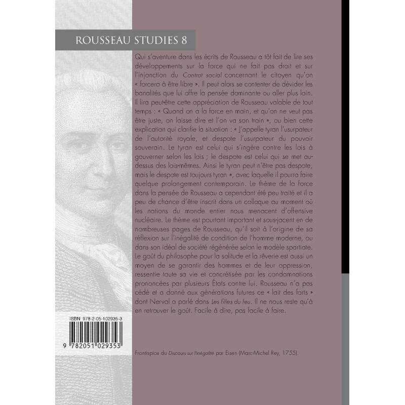 Qui s’aventure dans les écrits de Rousseau a tôt fait de lire ses développements sur la force qui ne fait pas droit et sur l’injonction du Contrat social concernant le citoyen qu’on « forcera à être libre ». Il peut alors se contenter de dévider les banalités que lui offre la pensée dominante ou aller plus loin. Il lira peut-être cette appréciation de Rousseau valable de tout temps : « Quand on a la force en main, et qu’on ne veut pas être juste, on laisse dire et l’on va son train », ou bien cette explication qui clarifie la situation : « J’appelle tyran l’usurpateur de l’autorité royale, et despote l’usurpateur du pouvoir souverain. Le tyran est celui qui s’ingère contre les lois à gouverner selon les lois ; le despote est celui qui se met au-dessus des lois-mêmes. Ainsi le tyran peut n’être pas despote, mais le despote est toujours tyran », avec laquelle il pourra faire quelque prolongement contemporain. Le thème de la force dans la pensée de Rousseau a cependant été peu traité et il a peu de chance d’être inscrit dans un colloque au moment où les nations du monde entier nous menacent d’offensive nucléaire. Le thème est pourtant important et sous-jacent en de nombreuses pages de Rousseau, qu’il soit à l’origine de sa réflexion sur l’inégalité de condition de l’homme moderne, ou dans son idéal de société régénérée selon le modèle spartiate. Le goût du philosophe pour la solitude et la rêverie est aussi un moyen de se garantir des hommes et de leur oppression, ressentie toute sa vie et concrétisée par les condamnations prononcées par plusieurs États contre lui. Rousseau n’a pas cédé et a donné aux générations futures ce « lait des forts » dont Nerval a parlé dans Les filles du feu. Il ne nous reste qu’à en retrouver le goût. Facile à dire, pas facile à faire.