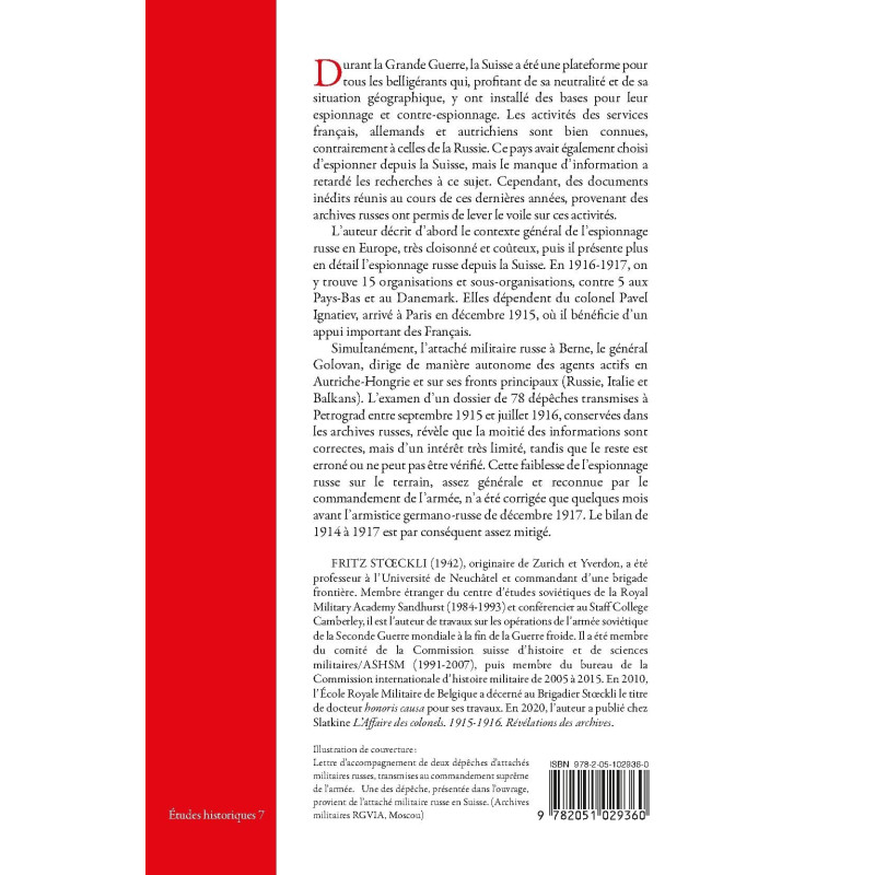 FRITZ STŒCKLI (1942), originaire de Zurich et Yverdon, a été professeur à l’Université de Neuchâtel et commandant d’une brigade frontière. Membre étranger du centre d’études soviétiques de la Royal Military Academy Sandhurst (1984-1993) et conférencier au Staff College Camberley, il est l’auteur de travaux sur les opérations de l’armée soviétique de la Seconde Guerre mondiale à la fin de la Guerre froide. Il a été membre du comité de la Commission suisse d’histoire et de sciences militaires/ASHSM (1991-2007), puis membre du bureau de la Commission internationale d’histoire militaire de 2005 à 2015. En 2010, l’École Royale Militaire de Belgique a décerné au Brigadier Stœckli le titre de docteur honoris causa pour ses travaux. En 2020, l’auteur a publié chez Slatkine L’Affaire des colonels. 1915-1916. Révélations des archives.