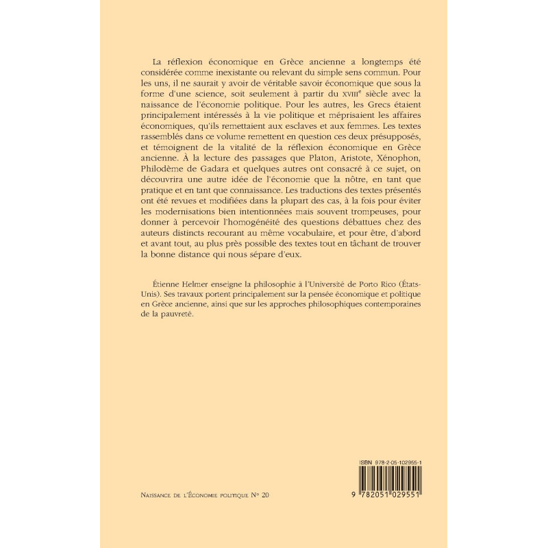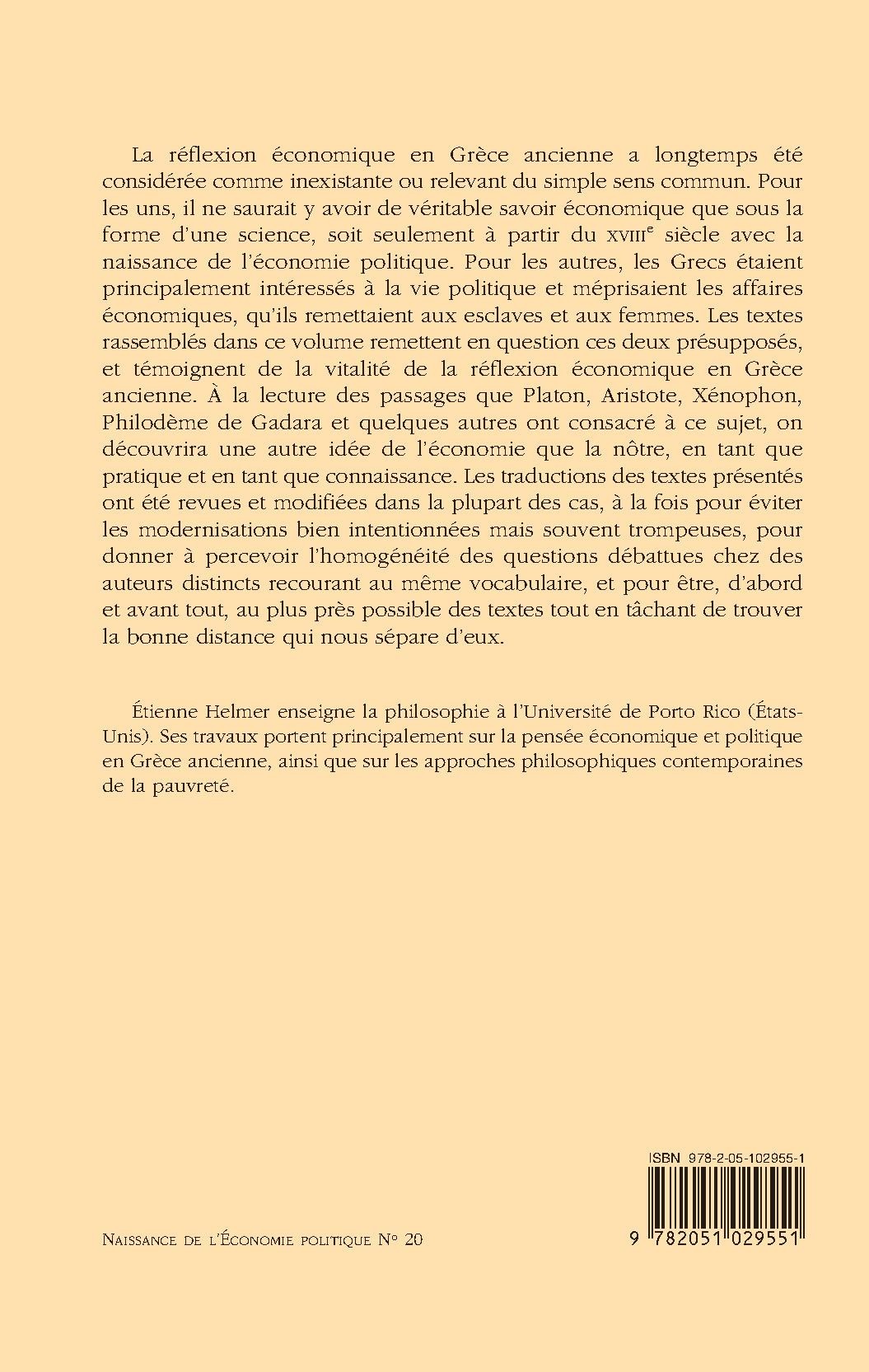 La réflexion économique en Grèce ancienne a longtemps été considérée comme inexistante ou relevant du simple sens commun. Pour les uns, il ne saurait y avoir de véritable savoir économique que sous la forme d’une science, soit seulement à partir du XVIIIe siècle avec la naissance de l’économie politique. Pour les autres, les Grecs étaient principalement intéressés à la vie politique et méprisaient les affaires économiques, qu’ils remettaient aux esclaves et aux femmes. Les textes rassemblés dans ce volume remettent en question ces deux présupposés, et témoignent de la vitalité de la réflexion économique en Grèce ancienne. À la lecture des passages que Platon, Aristote, Xénophon, Philodème de Gadara et quelques autres ont consacré à ce sujet, on découvrira une autre idée de l’économie que la nôtre, en tant que pratique et en tant que connaissance. Les traductions des textes présentés ont été revues et modifiées dans la plupart des cas, à la fois pour éviter les modernisations bien intentionnées mais souvent trompeuses, pour donner à percevoir l’homogénéité des questions débattues chez des auteurs distincts recourant au même vocabulaire, et pour être, d’abord et avant tout, au plus près possible des textes tout en tâchant de trouver la bonne distance qui nous sépare d’eux.