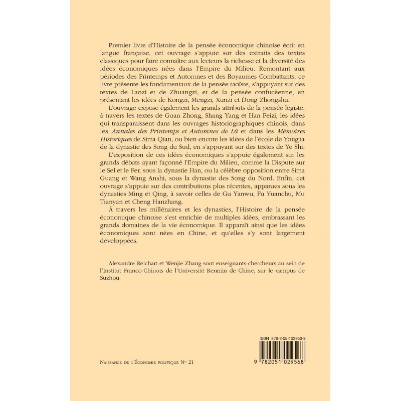 Premier livre d’Histoire de la pensée économique chinoise écrit en langue française, cet ouvrage s’appuie sur des extraits des textes classiques pour faire connaître aux lecteurs la richesse et la diversité des idées économiques nées dans l’Empire du Milieu. Remontant aux périodes des Printemps et Automnes et des Royaumes Combattants, ce livre présente les fondamentaux de la pensée taoïste, s’appuyant sur des textes de Laozi et de Zhuangzi, et de la pensée confucéenne, en présentant les idées de Kongzi, Mengzi, Xunzi et Dong Zhongshu.