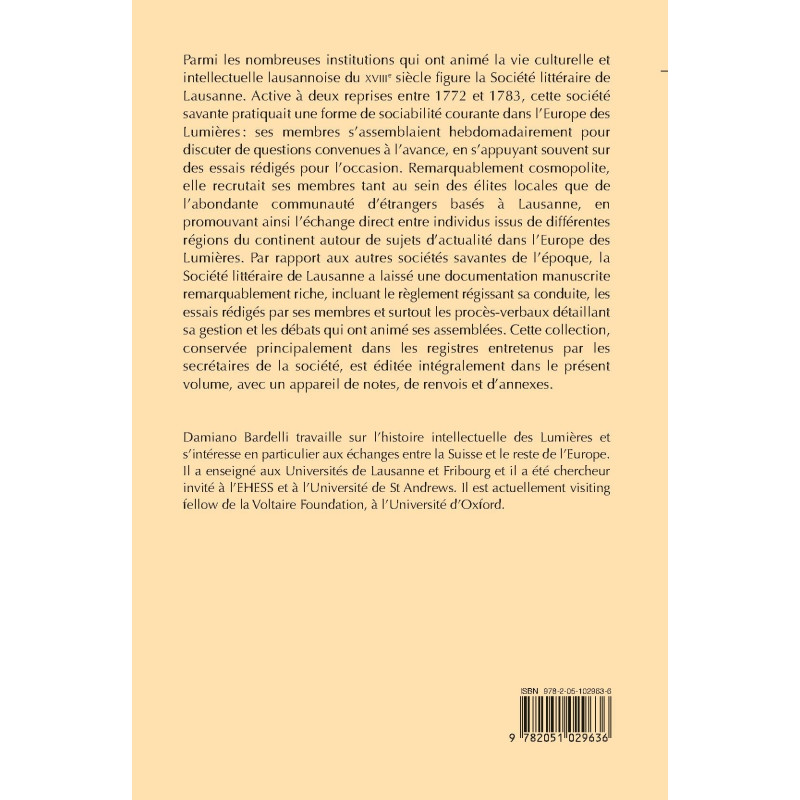 Parmi les nombreuses institutions qui ont animé la vie culturelle et intellectuelle lausannoise du XVIIIe siècle figure la Société littéraire de Lausanne. Active à deux reprises entre 1772 et 1783, cette société savante pratiquait une forme de sociabilité courante dans l’Europe des Lumières : ses membres s’assemblaient hebdomadairement pour discuter de questions convenues à l’avance, en s’appuyant souvent sur des essais rédigés pour l’occasion. Remarquablement cosmopolite, elle recrutait ses membres tant au sein des élites locales que de l’abondante communauté d’étrangers basés à Lausanne, en promouvant ainsi l’échange direct entre individus issus de différentes régions du continent autour de sujets d’actualité dans l’Europe des Lumières. Par rapport aux autres sociétés savantes de l’époque, la Société littéraire de Lausanne a laissé une documentation manuscrite remarquablement riche, incluant le règlement régissant sa conduite, les essais rédigés par ses membres et surtout les procès-verbaux détaillant sa gestion et les débats qui ont animé ses assemblées. Cette collection, conservée principalement dans les registres entretenus par les secrétaires de la société, est éditée intégralement dans le présent volume, avec un appareil de notes, de renvois et d’annexes.